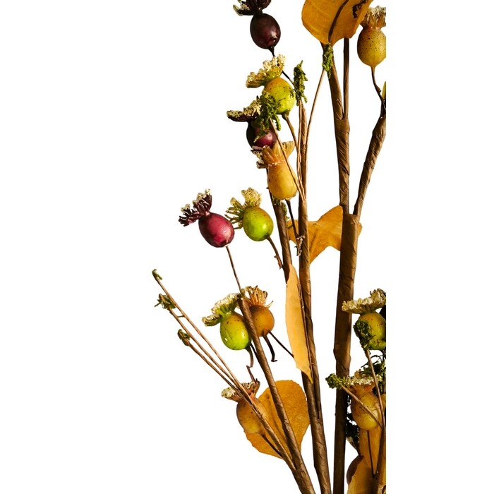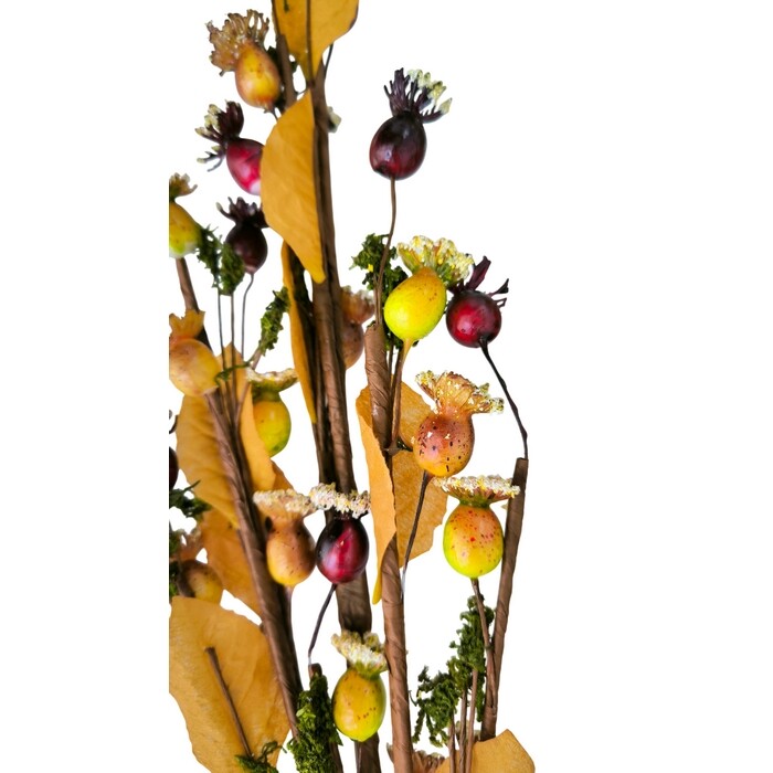 Dekorativní větvička se šípky o výšce 89 cm je působivým podzimním doplňkem, který krásně oživí interiér i chráněné venkovní prostory. Kombinace barevných šípků, zeleného mechu a žlutohnědých listů působí přirozeně a dokonale navodí atmosféru podzimu. Díky své délce se větvička hodí do váz, podzimních aranžmá nebo jako součást věnců.Listy jsou vyrobeny z textilu, takže působí realisticky a dodávají dekoraci jemnost. Šípky jsou z lakovaného polystyrenu, který jim zajišťuje lesklý vzhled a odolnost. Doplňkový mech vytváří přírodní dojem a stonek je tvořen drátkem obtočeným papírem, což umožňuje větvičku ohýbat a snadno tvarovat podle potřeby. Každý kus je navíc ručně vyrobený, což z něj činí originální dekoraci s důrazem na detail.Tento dekorativní prvek je ideální volbou pro všechny, kdo chtějí dodat svému domovu autentickou podzimní atmosféru a hledají variabilní ozdobu s dlouhou životností.Hlavní výhody produktu: realistické provedení podzimních šípků a listů ruční práce s důrazem na detail flexibilní stonek umožňující snadné tvarování vhodná dekorace do váz, aranžmá i věnců odolné a trvanlivé materiályObsah balení: 6x dekorativní větvička se šípkyParametry a specifikace: výška: 89 cm materiál listy: textil materiál šípky: polystyren lakovaný materiál mech: přírodní vzhled, dekorativní úprava stonek: drát obtočený papírem výroba: ruční práce použití: interiér, chráněné venkovní prostory