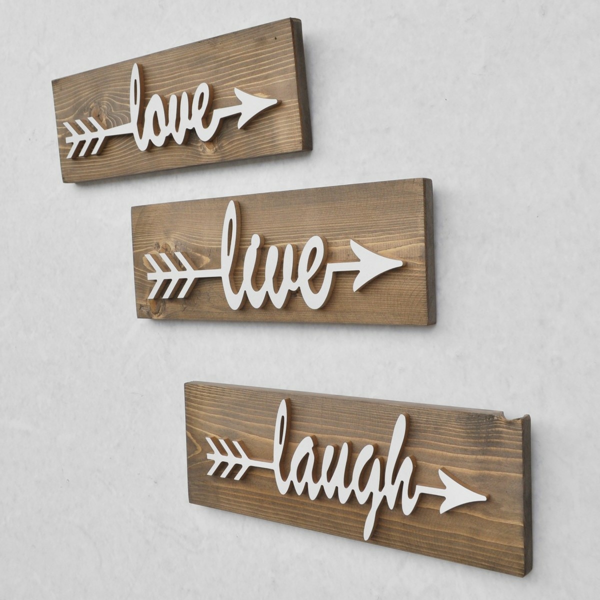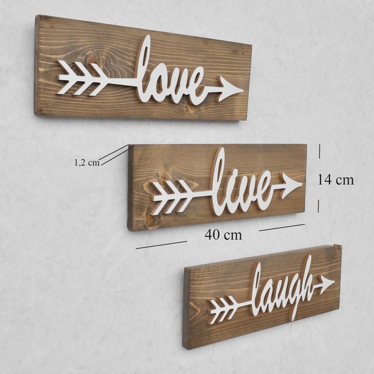 Dekorativní sada dřevěných cedulek Love, Live, Laugh je vyrobena ze 100% smrkového dřeva a přináší do interiéru pozitivní atmosféru i originální vzhled. Díky ruční výrobě má každý kus jedinečný charakter a přírodní kresba dřeva v kombinaci s bílým plastickým nápisem vytváří výrazný kontrast. Stylové provedení s motivem šipek dodává cedulkám moderní i rustikální nádech a hodí se do obývacího pokoje, ložnice nebo předsíně.Každá cedulka má rozměry 40 × 14 × 1,2 cm a jejich nízká hmotnost usnadňuje připevnění na zeď. Díky praktickému zpracování lze jednotlivé díly umístit pohromadě jako sadu nebo samostatně, podle toho, jaký efekt chcete ve svém interiéru docílit. Cedulky jsou navrženy pro snadnou montáž a jejich nosnost 1,5 kg zajistí stabilní upevnění.Jednoduchý a zároveň výrazný design v sobě spojuje estetickou i symbolickou hodnotu. Sada se stane inspirativním doplňkem, který každý den připomene radost z lásky, života i smíchu. Díky přírodnímu materiálu navíc působí hřejivě a dokonale zapadne do útulného prostředí.Hlavní výhody produktu: sada tří dekorativních cedulek s nápisy love, live, laugh vyrobeno ze 100% smrkového dřeva ruční výroba s důrazem na detail přírodní vzhled s bílými 3D nápisy a motivem šipky možnost upevnění na zeď univerzální použití do různých místnostíObsah balení: 3x dřevěná cedulka love, live, laughParametry a specifikace: materiál: smrkové dřevo výroba: ruční rozměry: 40 × 14 × 1,2 cm počet kusů: 3 montáž: samostatná, připevnění na zeď nosnost: 1,5 kg