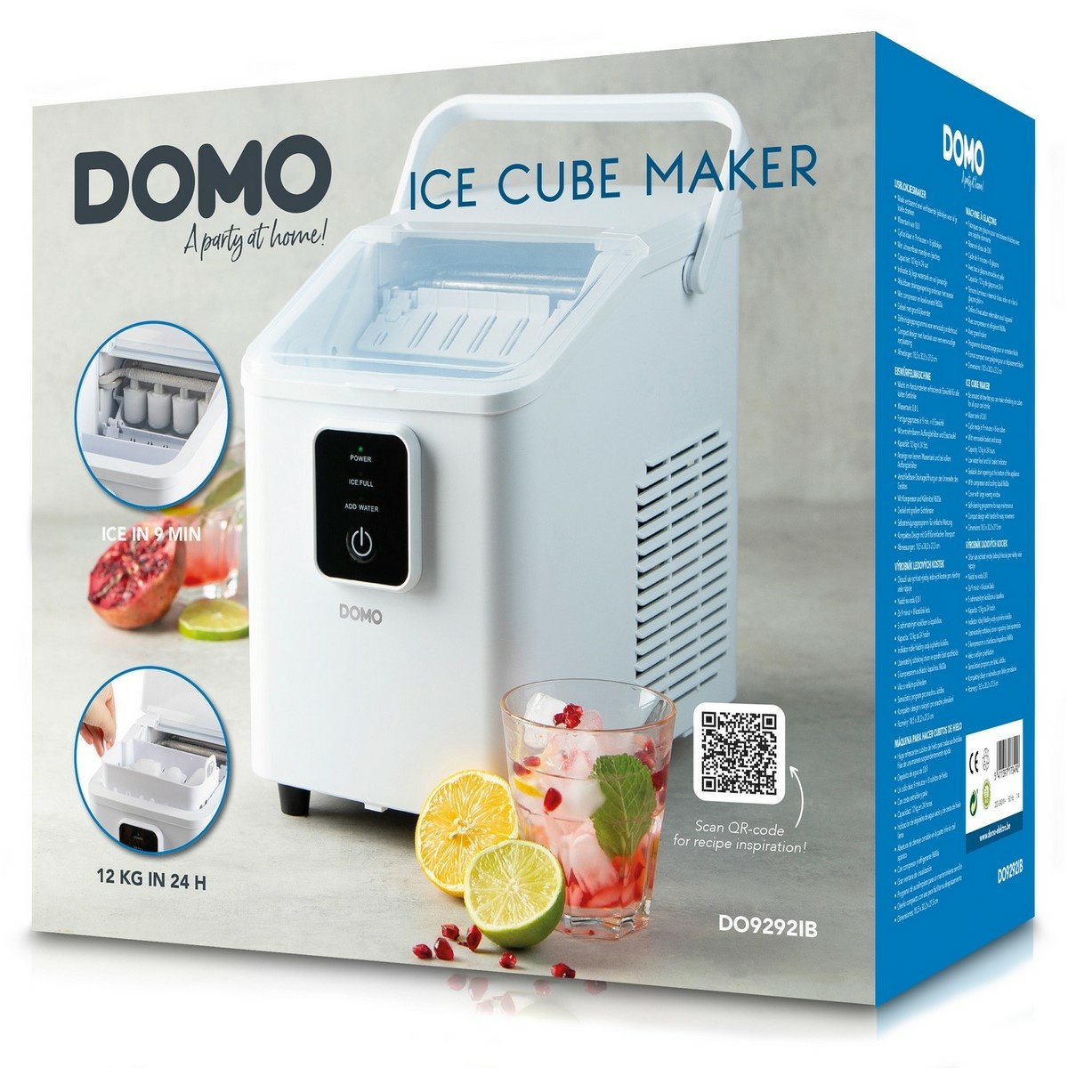 Kompaktní, výkonný a mimořádně praktický – takový je domácí výrobník ledu DOMO DO9292IB, který i přes své malé rozměry dokáže vyprodukovat až 12 kg ledu za 24 hodin. První kostky ledu získáte už za 9 minut od zapnutí, a každých 8 minut přibude dalších 8 čerstvých kostek. Díky sklopné rukojeti je přístroj snadno přenosný, což oceníte jak doma, tak na zahradě při letních oslavách, grilování nebo přípravě osvěžujících nápojů.Zásobník pojme přibližně 370 gramů hotového ledu, ale díky rychlé výrobě není problém vytvořit větší zásobu například do mrazáku. Průhledné víko umožňuje kontrolu průběhu výroby bez otevírání, zatímco jednoduché ovládání tlačítkem, světelné kontrolky a automatický čistící program zajišťují maximální komfort při obsluze i údržbě. Přístroj je navržen pro efektivní provoz v domácích podmínkách, a to díky ekologickému chladivu R600a a energeticky úspornému kompresoru s příkonem pouze 120 W.DOMO DO9292IB je skvělým doplňkem pro každého, kdo chce mít po ruce led kdykoli a bez starostí. Ať už chystáte osvěžující limonády, ledovou kávu nebo koktejly na večírek, tento výrobník se stane vaším spolehlivým parťákem.Parametry a specifikace Typ: domácí výrobník ledu Výkon: až 12 kg ledu / 24 h Objem nádržky na vodu: 0,8 litru Kapacita zásobníku: cca 370 g ledu Příkon: 120 W Barva: bílá Chladivo: ekologické R600a Ovládání: mechanické tlačítko Funkce: automatický čistící program, indikace nedostatku vody, plného zásobníku a zapnutí Další prvky: sklopná rukojeť, uzavíratelný vypouštěcí otvor, vyjímatelný koš, kompaktní rozměry