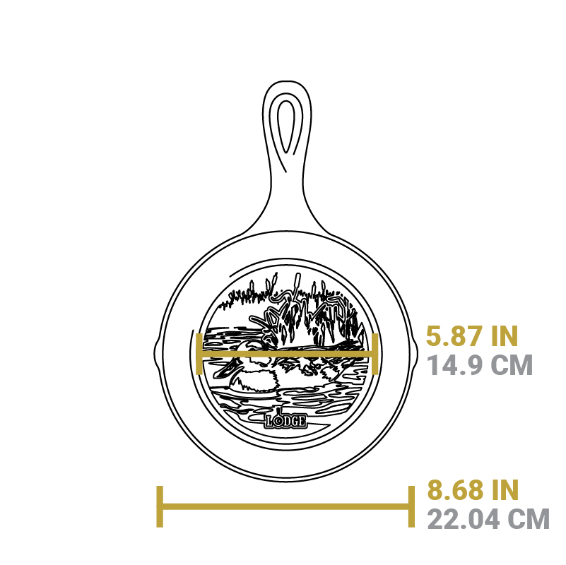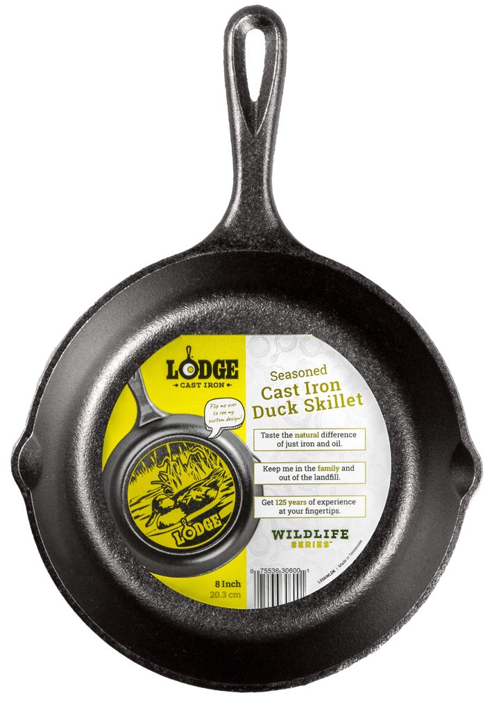 Litinová pánev Lodge Duck 20 cm je stylový kousek z řady Wildlife, zdobený reliéfem kačera na dně, který jí dodává osobitý říz. S vnější průměrem dna cca 15 cm, výškou kolem 4,7 cm a hmotností cca 1,6 kg nabízí perfektní akumulaci a rovnoměrné šíření tepla, ideální pro restování, smažení i dušení. Povrch je zcela přírodní, ošetřený zapečeným 100 % rostlinným olejem. Pánev je připravená k použití ihned po vybalení, bez chemického nepřilnavého povrchu na bázi PFAS.