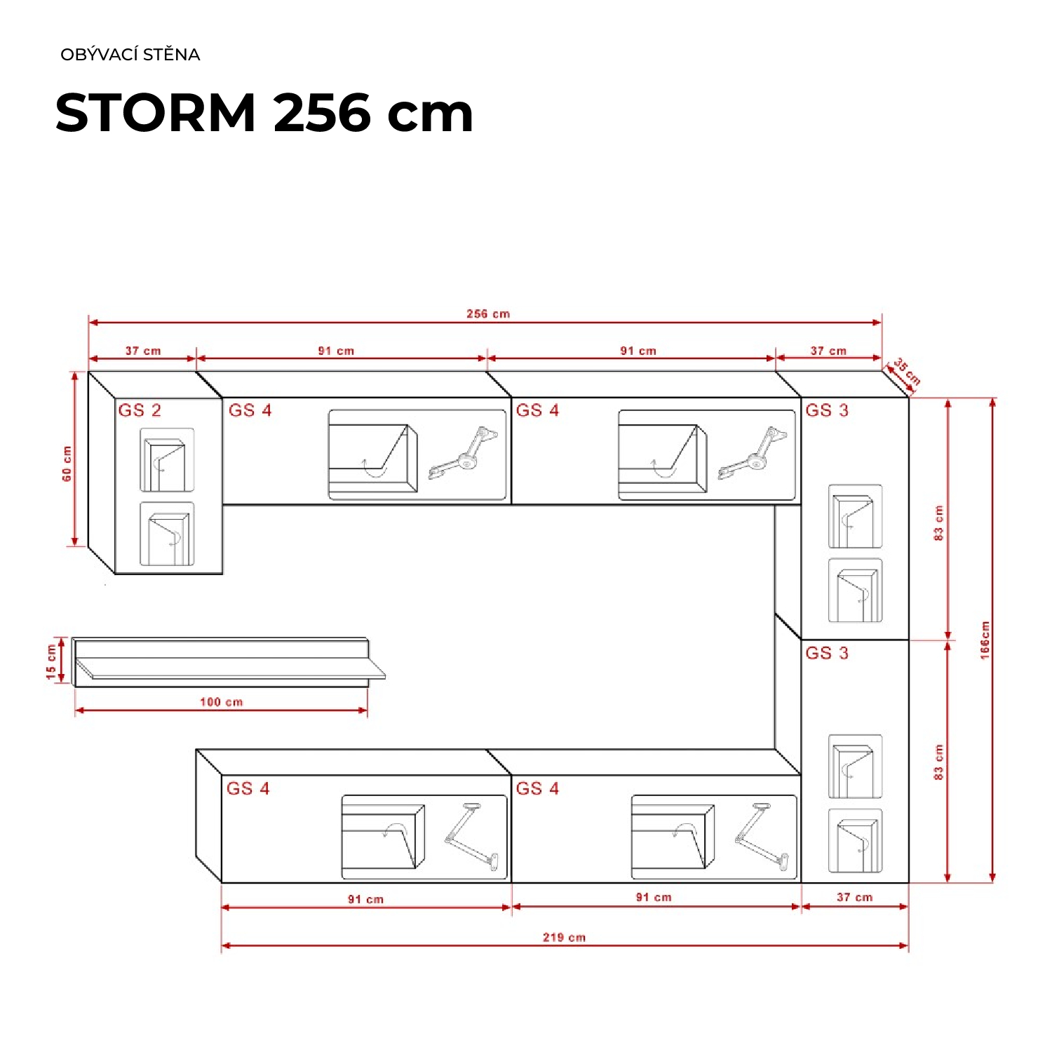 Ral Obývací stěna STORM 256 cm - Černý lesk + Bílá police
