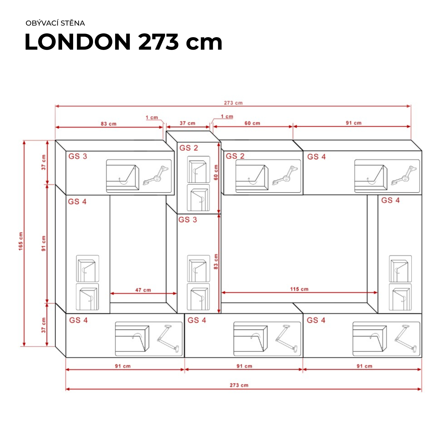 Ral Obývací stěna LONDON 3, 273 cm - Bílo/černý lesk
