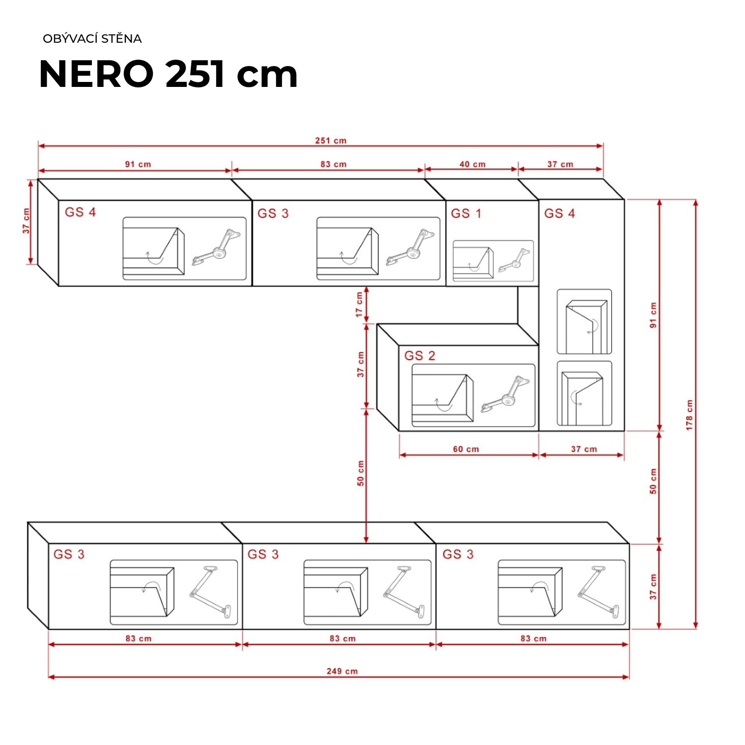 Ral Obývací stěna NERO 2, 251 cm - Bílý lesk