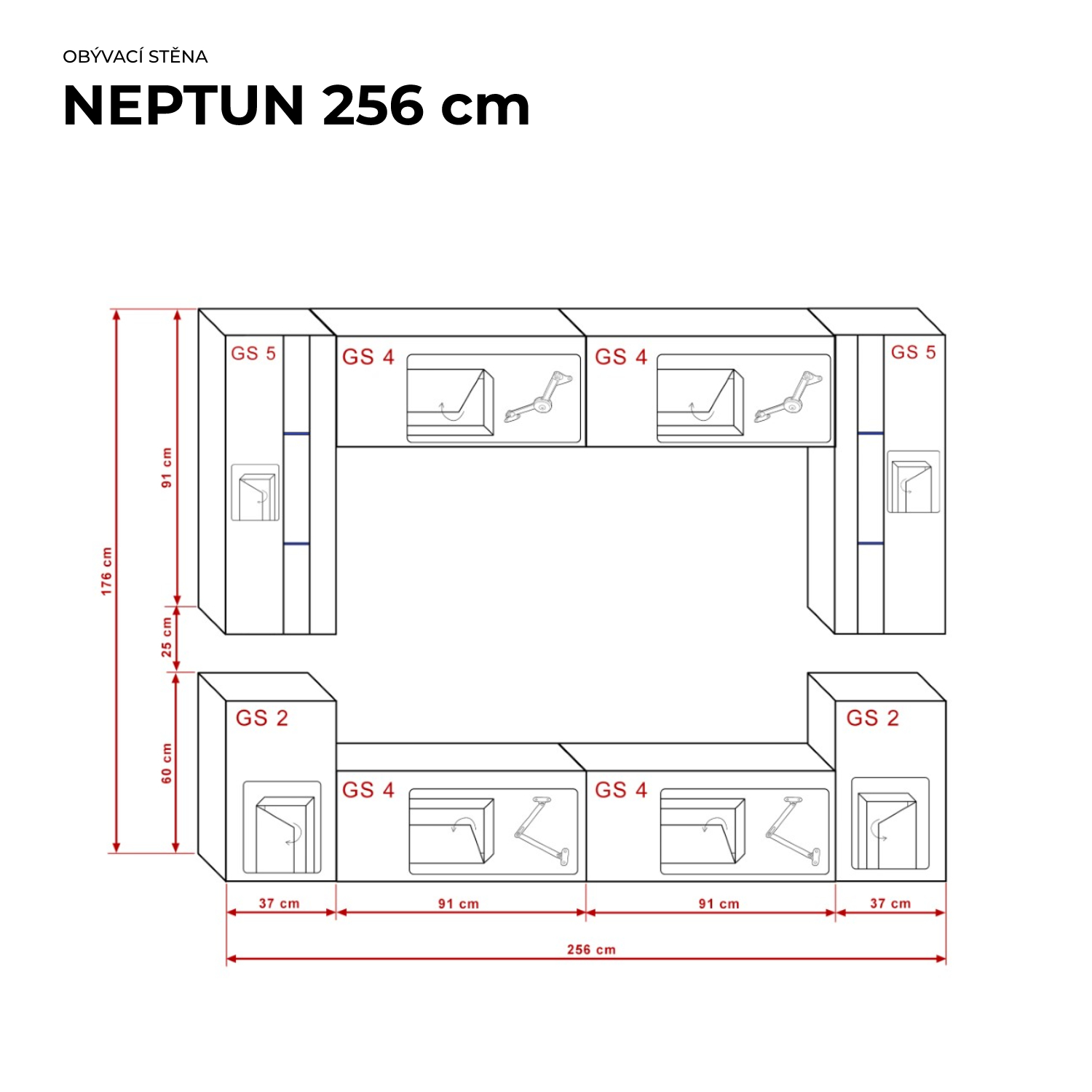 Ral Obývací stěna NEPTUN 4, 256 cm - Černý lesk