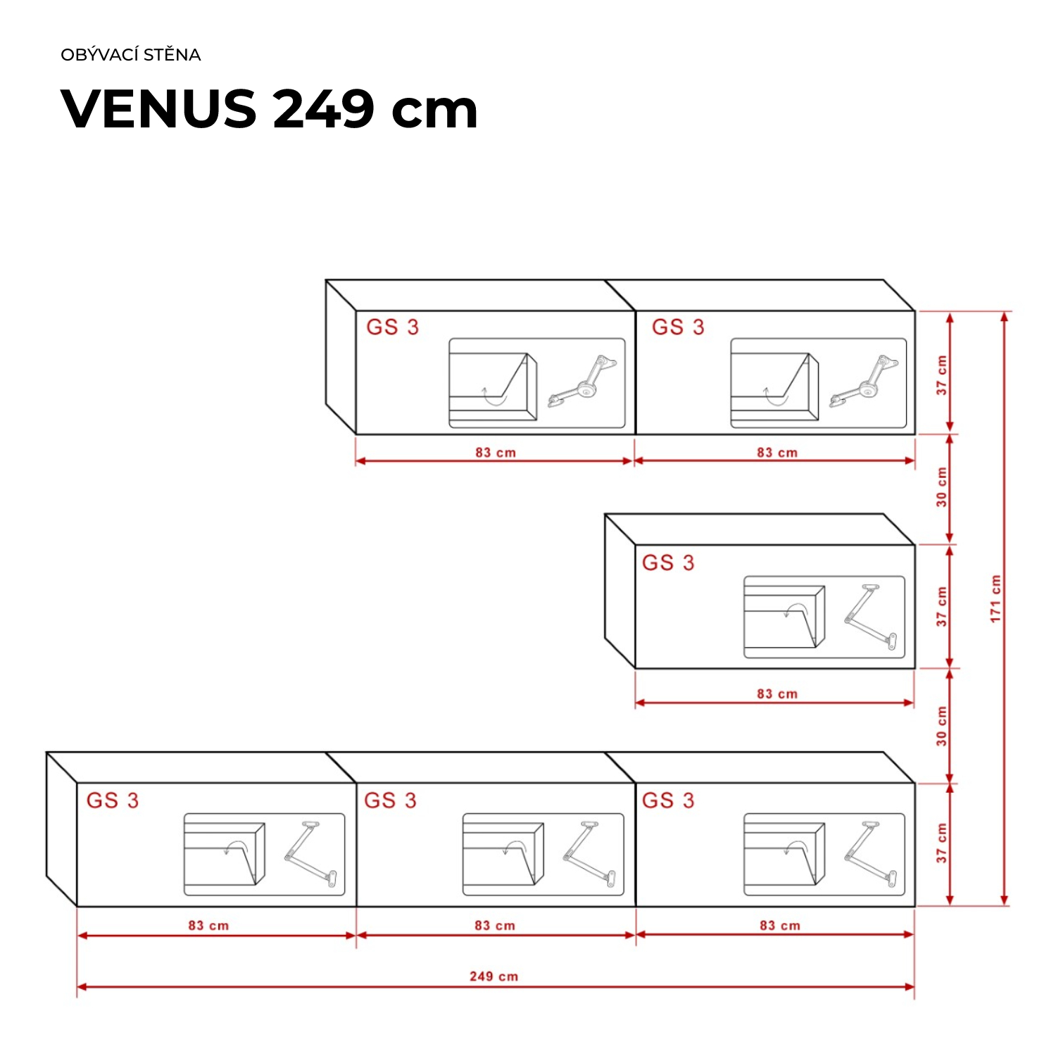 Ral Obývací stěna VENUS 8, 249 cm - Černo/bílý lesk