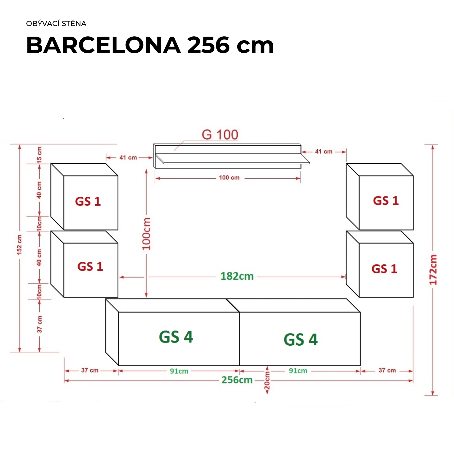 Ral Obývací stěna BARCELONA 4, 256 cm - Bílý lesk
