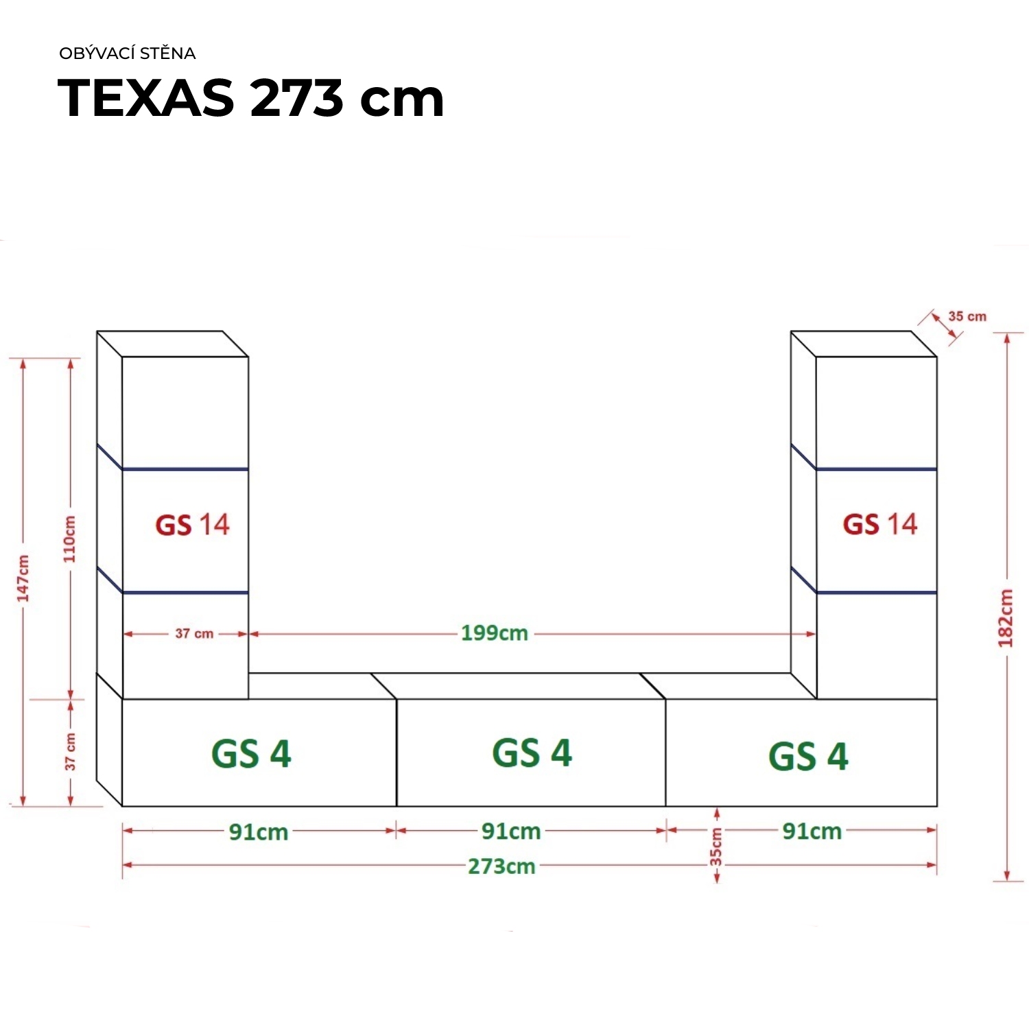 Ral Obývací stěna TEXAS 3, 273 cm - Černý lesk