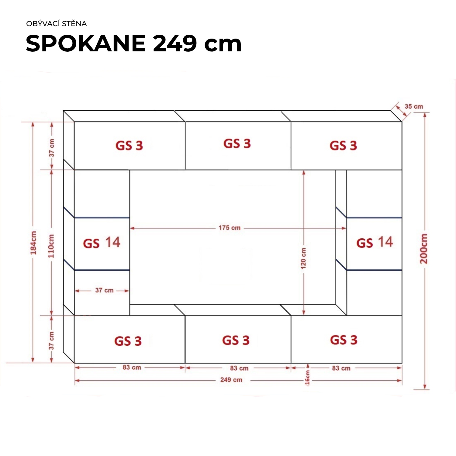 Ral Obývací stěna SPOKANE 3, 249 cm - Černý lesk