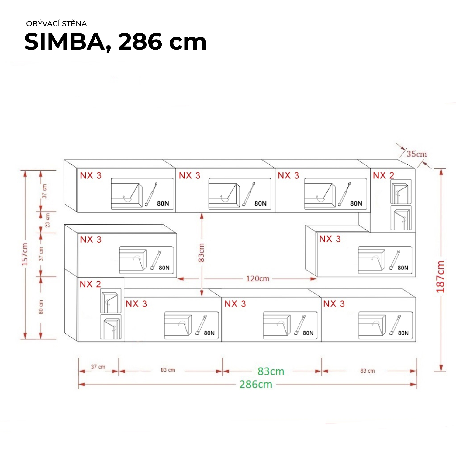 Ral Obývací stěna SIMBA 3, 286 cm - Bílo/černý lesk
