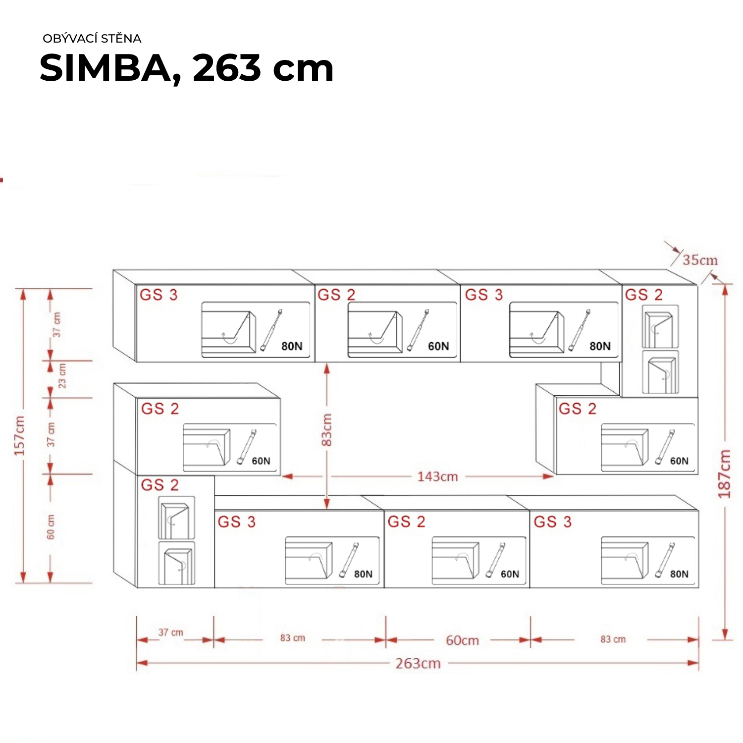 Ral Obývací stěna SIMBA 5, 263 cm - Černo/bílý lesk