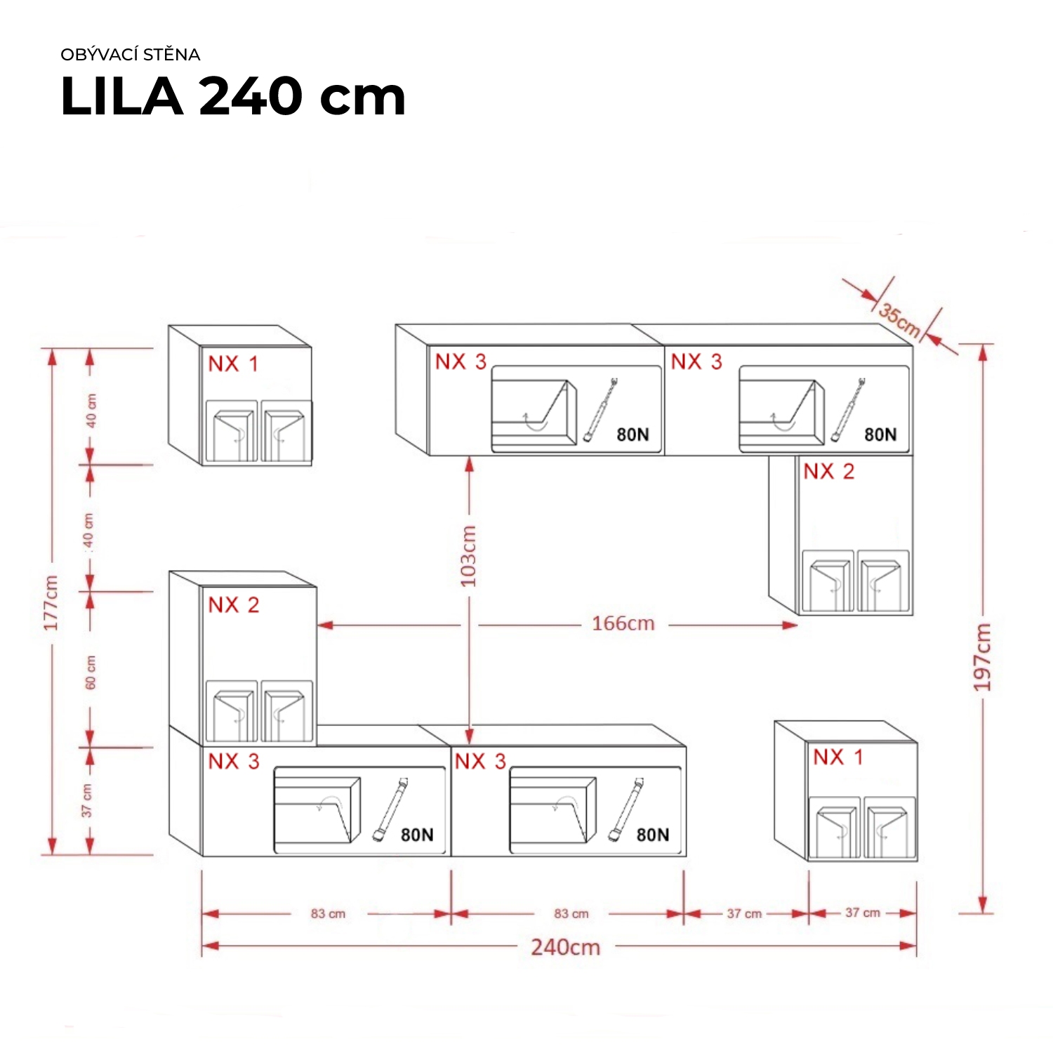 Ral Obývací stěna LILA 2, 240 cm - Černo/bílý lesk