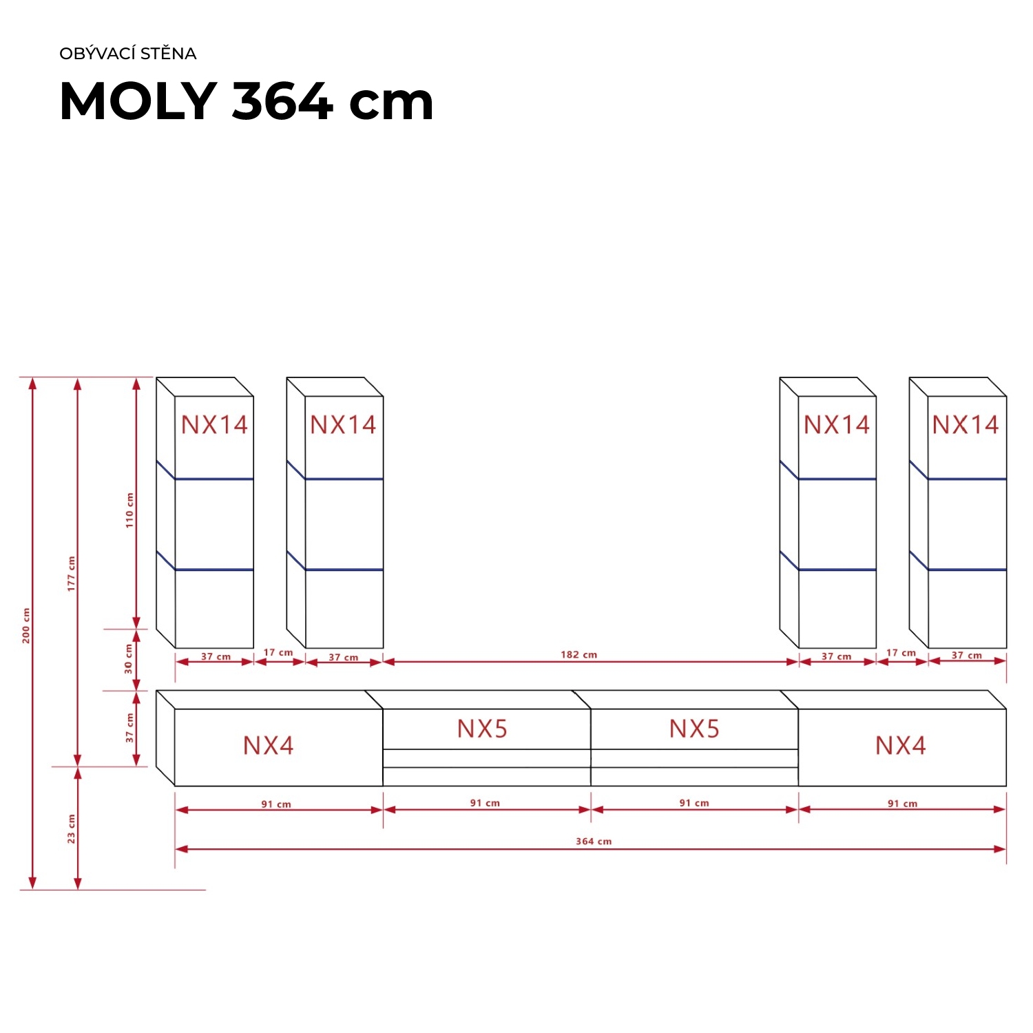 Ral Obývací stěna MOLY 364 cm - Černý lesk