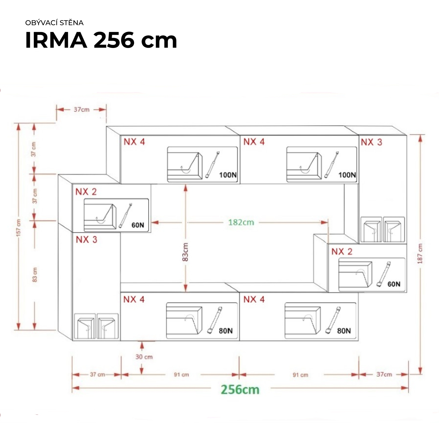 Ral Obývací stěna IRMA 6, 256 cm - Bílo/černý lesk