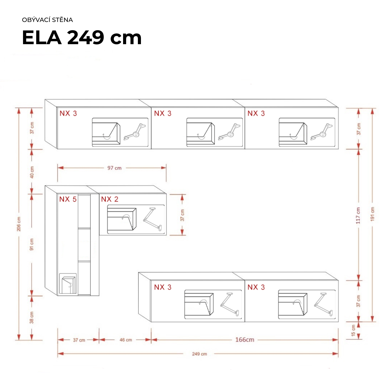 Ral Obývací stěna ELA 2, 249 cm - Černý lesk