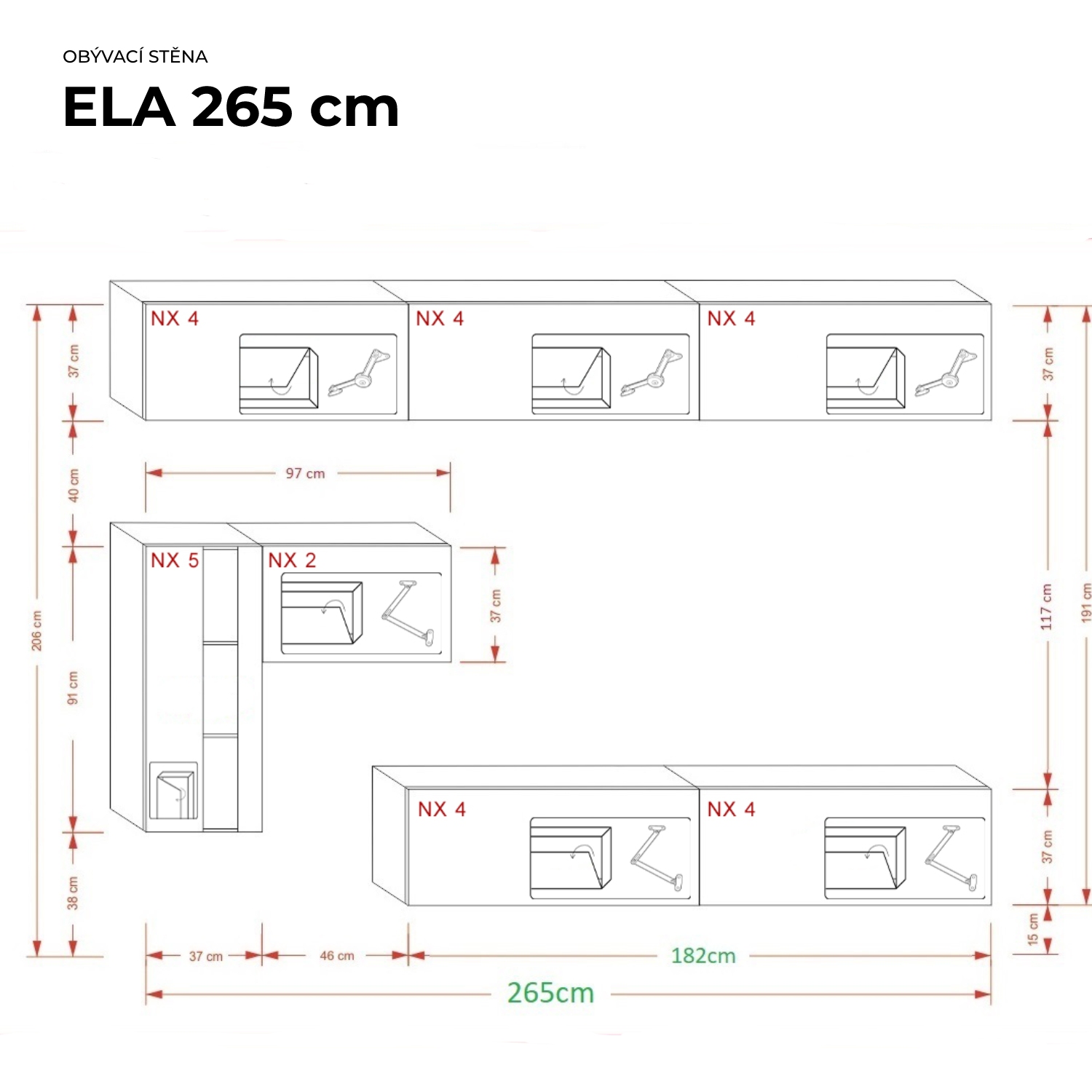 Ral Obývací stěna ELA 5, 265 cm - Černý lesk