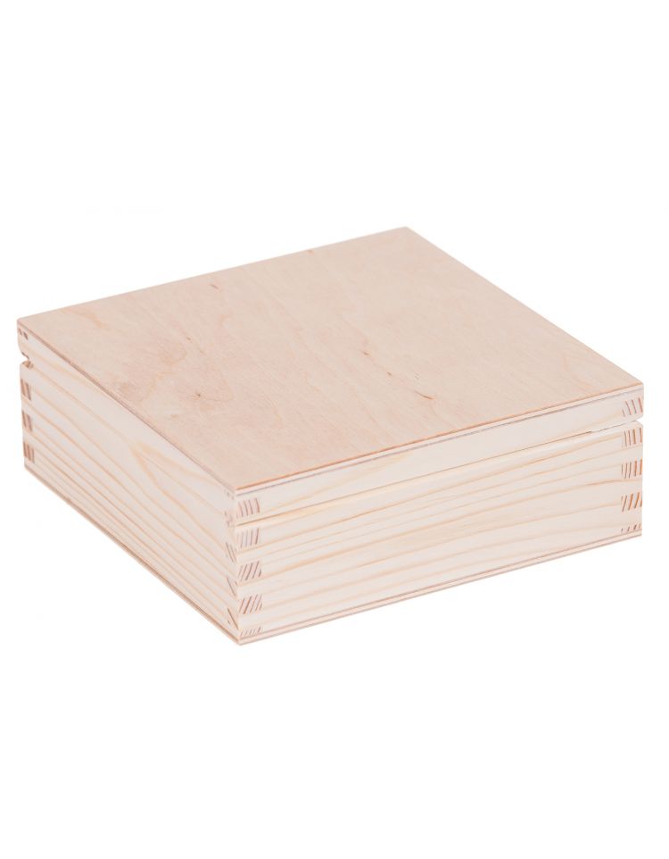 Dřevěná čtvercová středně velká krabice s pravidelnými rozměry a otevíracím víkem. Tento produkt není lakovaný, pečlivě vyrobený z borovicového dřeva, je spojován s jednoduchostí a tradicí. Perfektní jako dárek - šperkovnice, drobnosti.