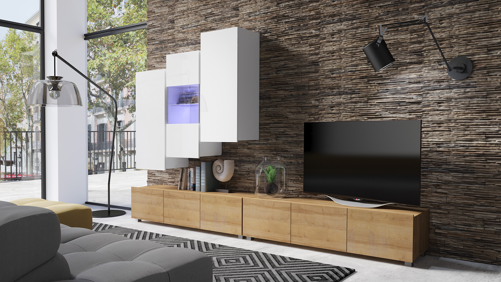 GAB Obývací stěna LORONA 17, Bílá/Zlatý dub 300 cm
