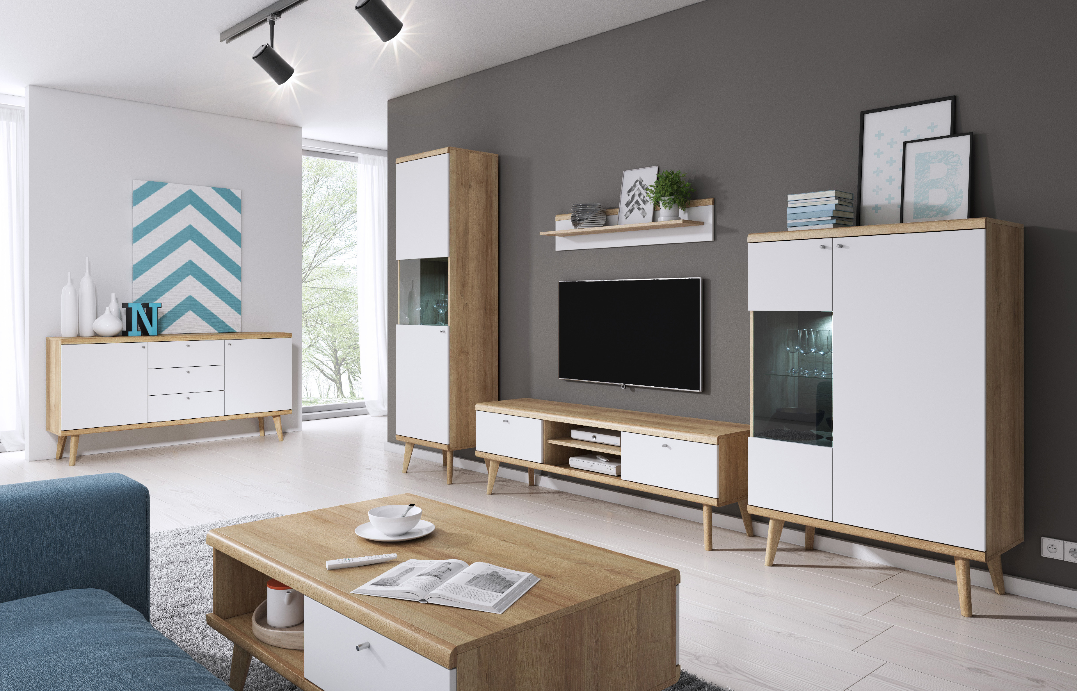 Každý kus nábytkuz kolekce PORO je velice stabilní, jelikož je umístěn na vysokých dřevěných nohou. Korpus je vyroben z kvalitní laminované dřevotřísky o tloušťce 16 mm v dekoru Dub Riviera/Bílá.