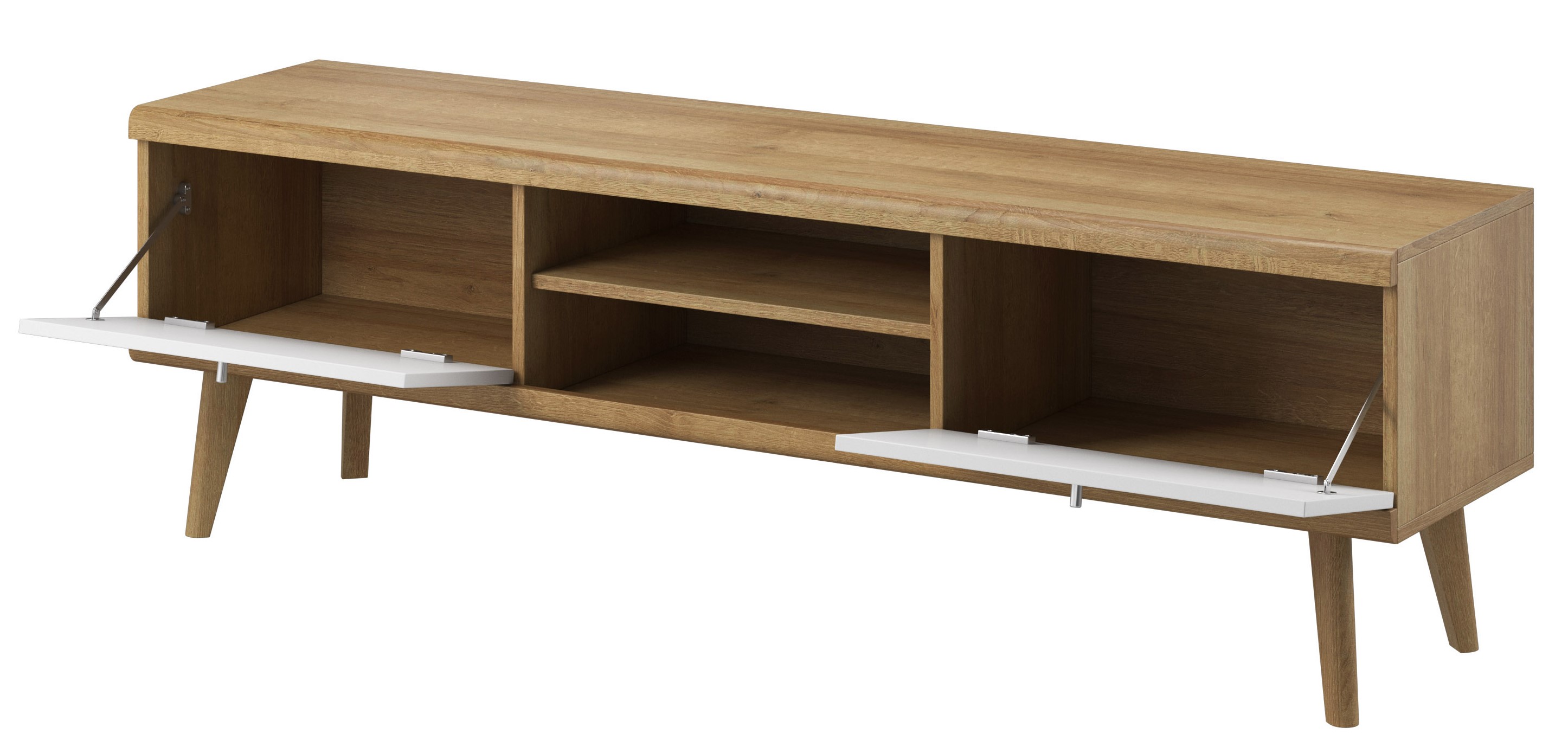 Televizní stolek je široký 160 cm, nabízí dostatek úložného prostoru v podobě dvou skříněk a jedné otevřené police.