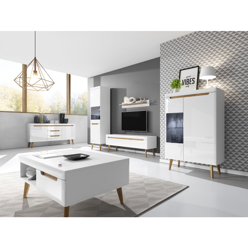 Představte si nejen moderní, ale také funkční kus nábytku, který se stane středobodem Vašeho obývacího pokoje - moderní konferenční stůl NADIA. Tento kousek nábytku je dokonalým spojením jedinečných přírodních a moderních prvků v kombinaci dekoru Bílá lesk/Dub Riviera s vysokými dřevěnými nohami v černé barvě a vybaven systémem push to open pro snadné otevírání a zavírání dvířek.
