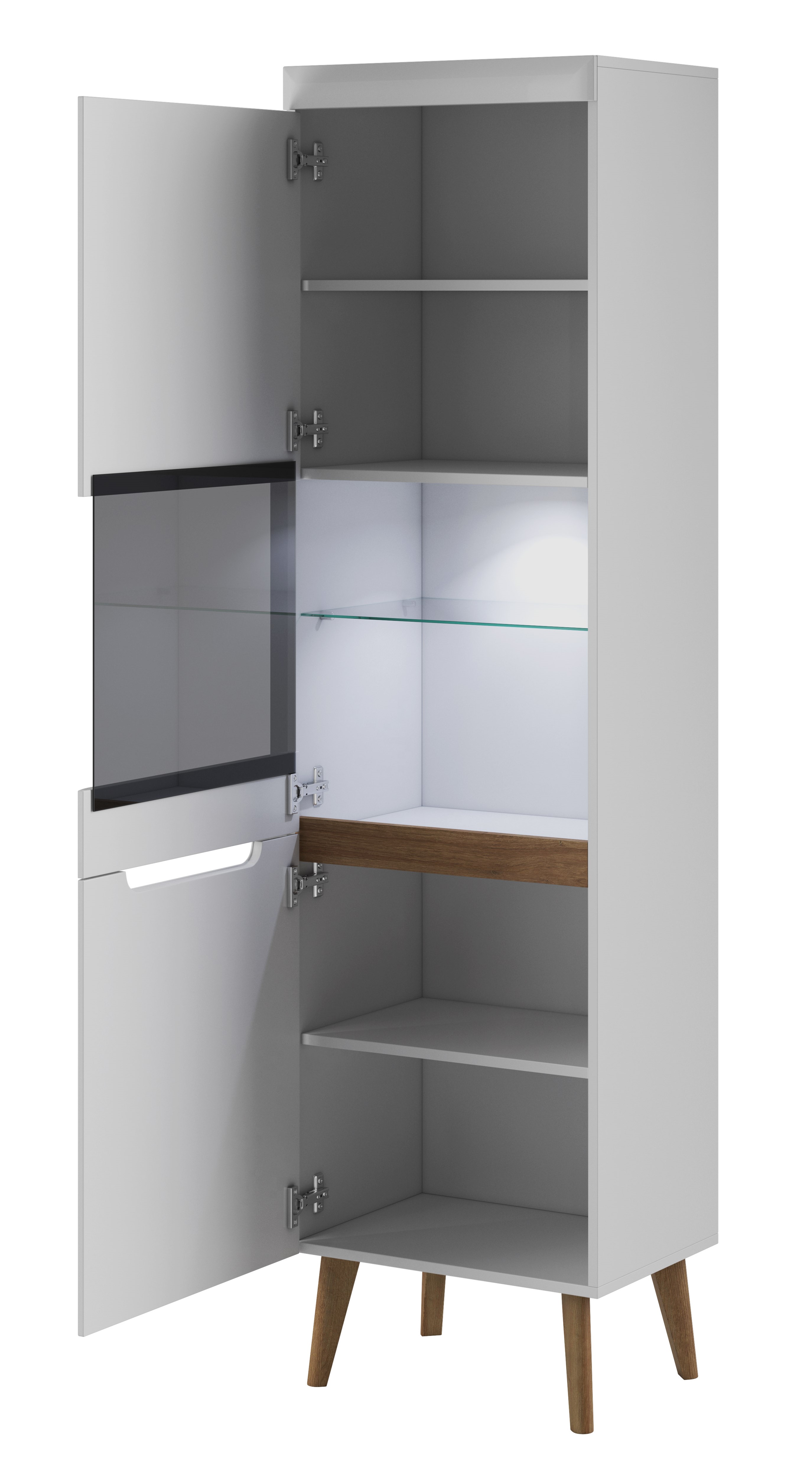Představte si nejen moderní, ale také funkční kus nábytku, který se stane středobodem Vašeho obývacího pokoje - moderní vitrínovou skříň NADIA. Tento kousek nábytku je dokonalým spojením jedinečných přírodních a moderních prvků v dekoru Bílá lesk/Dub Riviera s vysokými dřevěnými nohami v černé barvě a vybaven systémem push to open pro snadné otevírání a zavírání dvířek.