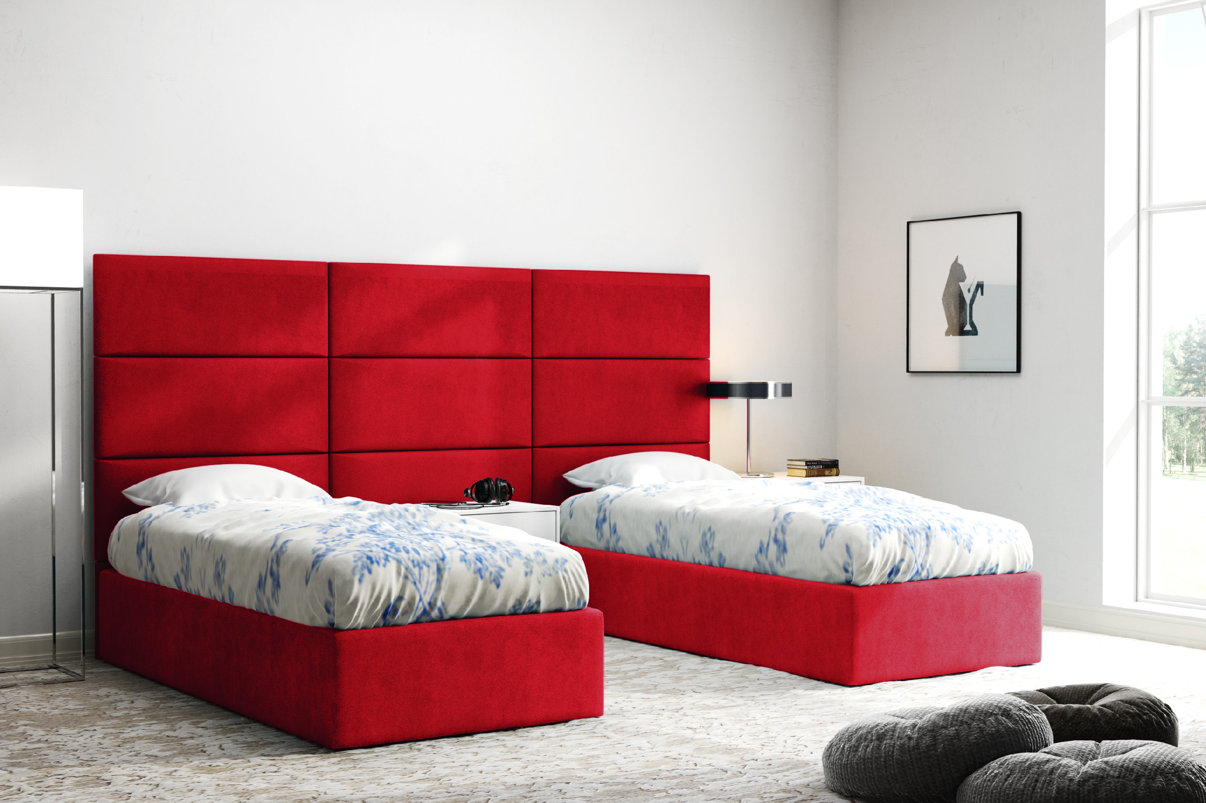 Hledáte elegantní povrchovou úpravu stěn, která dodá místnosti charakter? Naším návrhem jsou čalouněné panely. Dostupné jsou v módních látkách jako Trinity (plyš) a eko-kůže. Kombinací několika kousků získáte zajímavý vizuální efekt. Čalouněné panely jsou perfektní jako podpěra hlavy u postele. Měkká pěna a příjemná textura látky použitá na výrobu panelu umožní čtení knih a sledování televize v sedě.