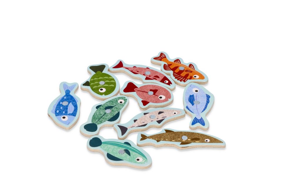 10 barevných dřevěných ryb - každá má na zadní straně jiný počet teček