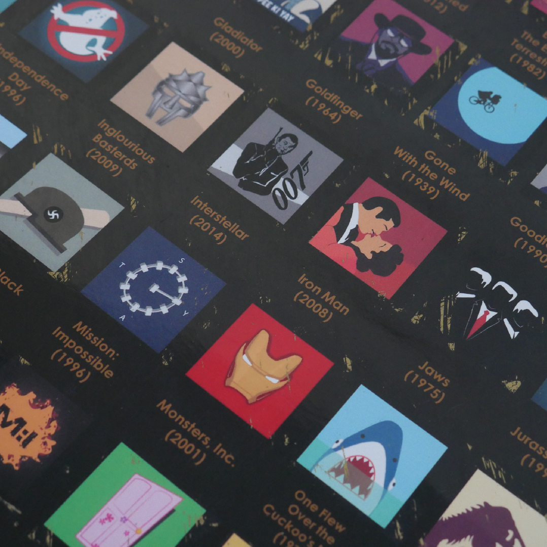 Od klasiky jako Hříšný tanec, Forrest Gump, přes novinky jako Bohemian Rhapsody či Zrodila se hvězda! Tento plakát pokrývá obrovské množství let i žánrů, které můžete objevovat. Perfektní dárek pro všechny!