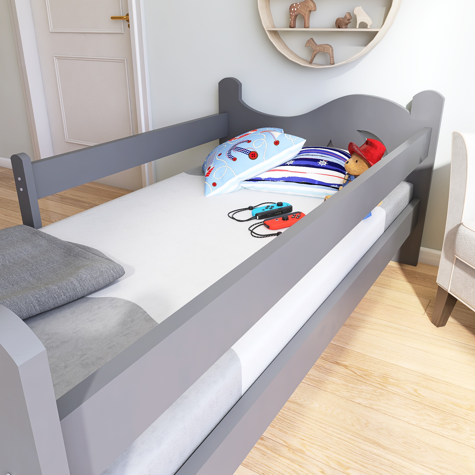 - Bezpečnost: Odnímatelná zábrana, když přijde čas na větší samostatnost a zaoblené hrany.