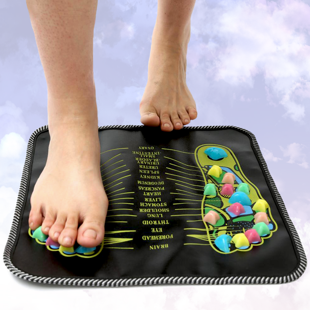 Akupresurní podložka dokonale splní účel domácí reflexní masáže. Jistou výhodou je, že nemusíte chodit k žádnému masérovi a masáž chodidel zvládnete díky podložce úplně sami doma či v kanceláři. Mini akupresurní podložka je černá a má na sobě různě barevné kamínky, které vyplňují obrysy chodidel. Kamínky odpovídají bodům v těle a chozením po nich uvolňujete vždy danou část těla.