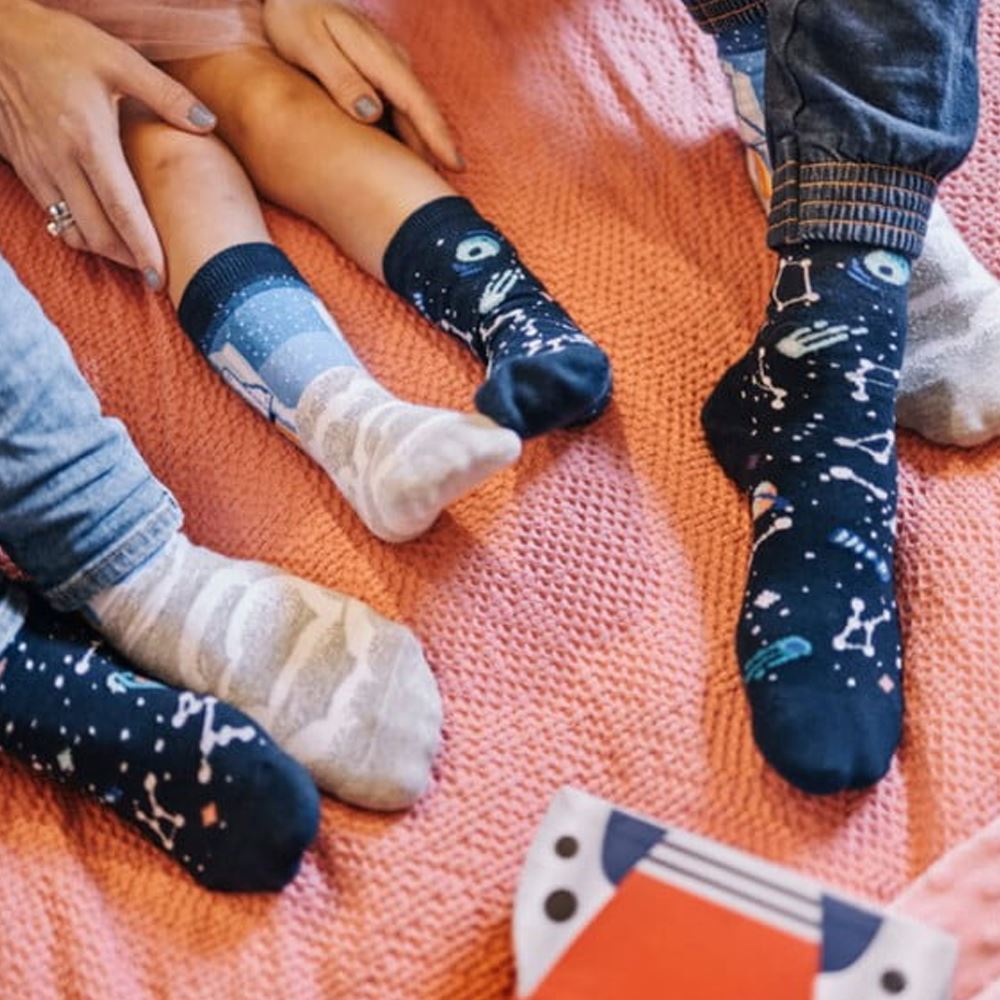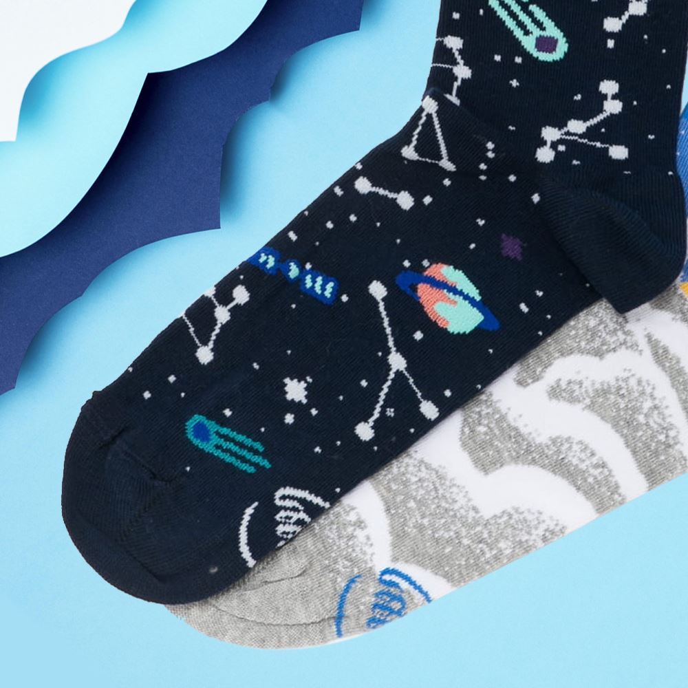 Nebojte se vystoupit z řady! Nudným jednobarevným ponožkám už dávno odzvonilo. Vybavte se těmi nejoriginálnějšími a nejveselejšími ponožkami. Ponožky s raketou a vesmírem jsou ideální pro všechny milovníky tajemných vzdálených planet a neprobádaného kosmického prostoru.