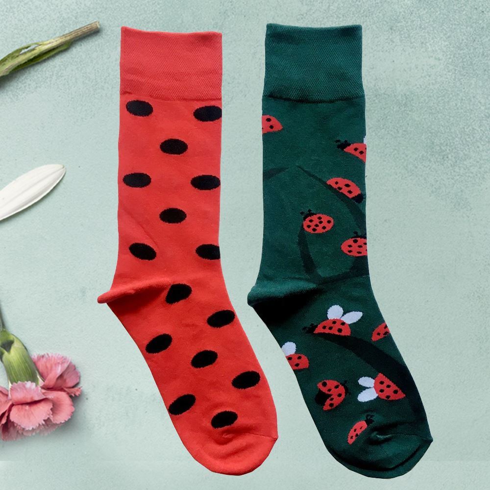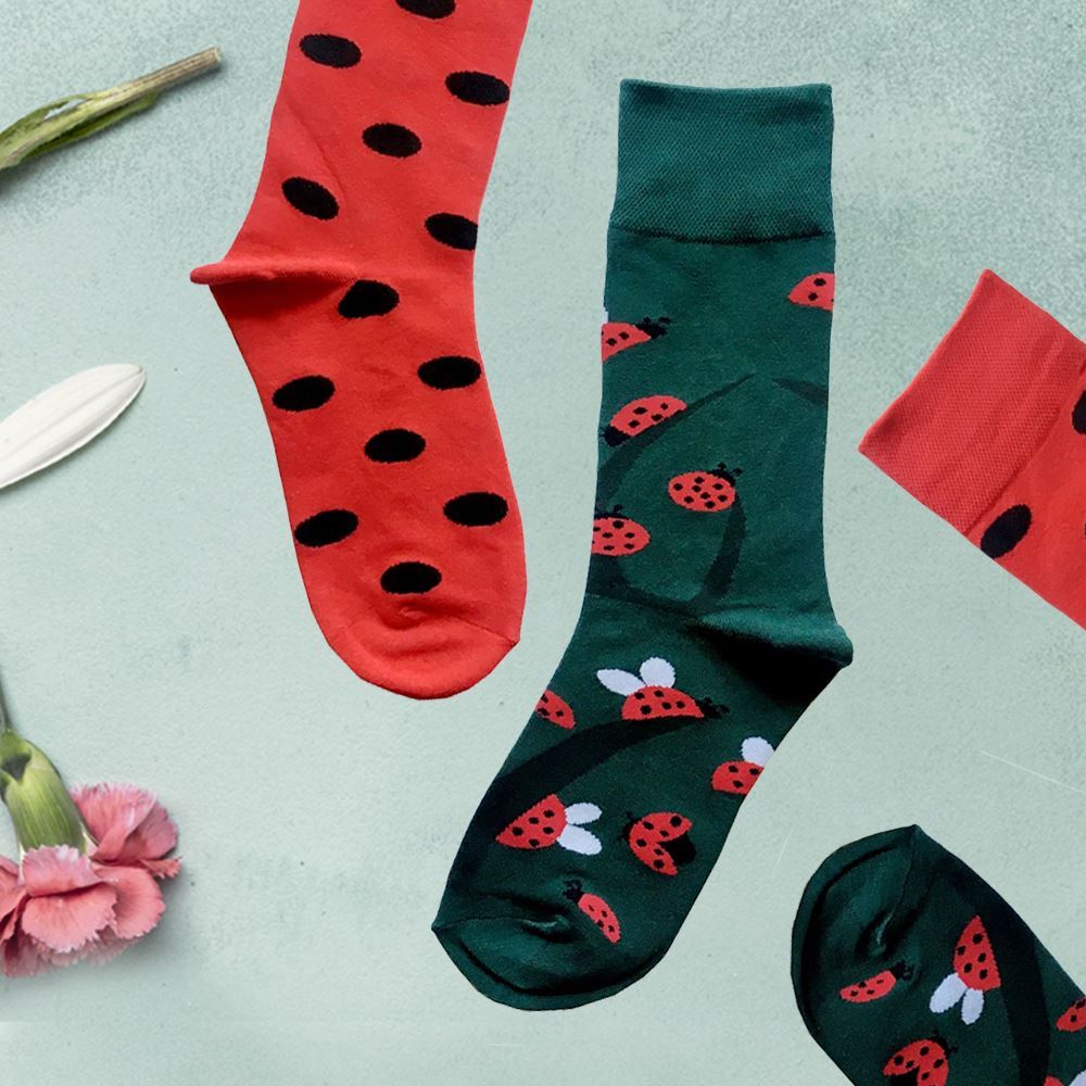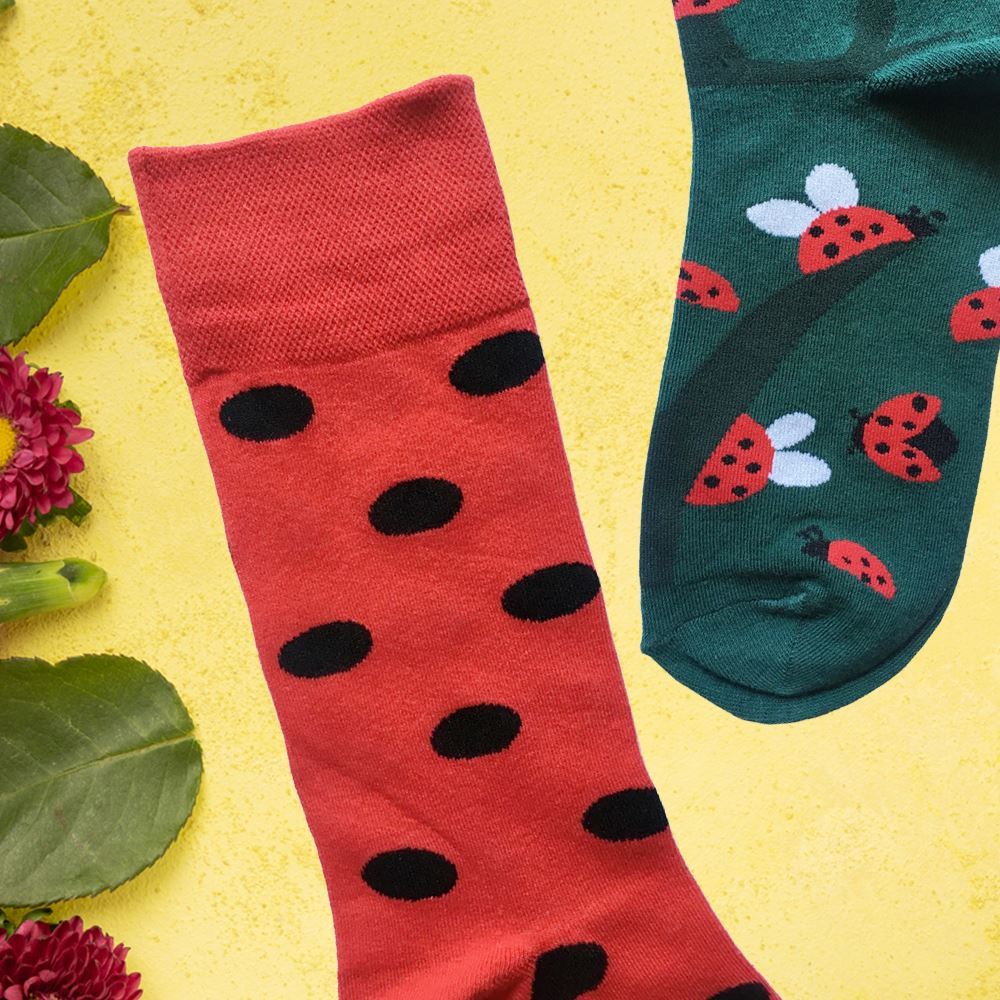 Veselých ponožek není nikdy dost! Ponožky s beruškami udělají radost sestře či kamarádce. Oživí nudný outfit a vylepší každý šatník. Nasaďte ponožky, vyhrňte nohavice a hurá do ulic. Díky příjemnému materiálu jsou velmi pohodlné při nošení. Veselé ponožky mají univerzální velikost. Jejich hlavní přednost spočívá v rozdílnosti a roztomilosti ponožek. Každá ponožka v páru je jiná - jedna má na sobě puntíky a druhá zmiňované berušky.