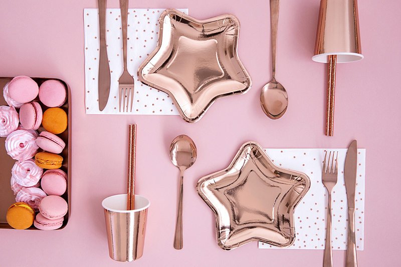 Papírové talířky ve tvaru hvězdy v barvě rose gold krásně doladí stůl každé narozeninové oslavy nebo večírku.