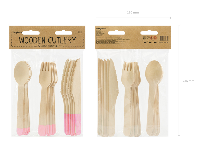 Dřevěné příbory přírodní s barevným koncem (světlá růžová) krásně doladí stůl každé narozeninové oslavy nebo večírku. Velikost příborů je 16 cm. Balení obsahuje 18 ks příborů.