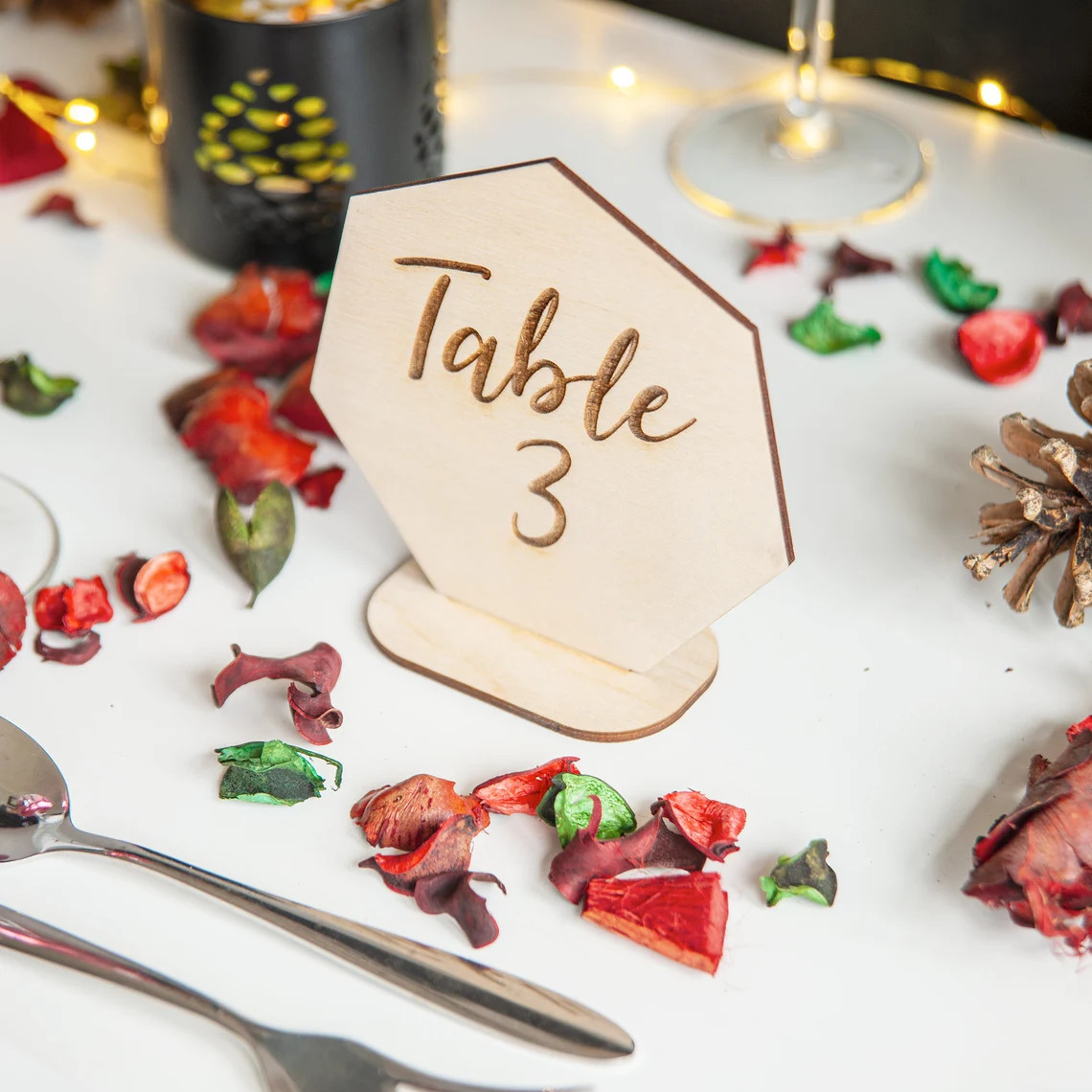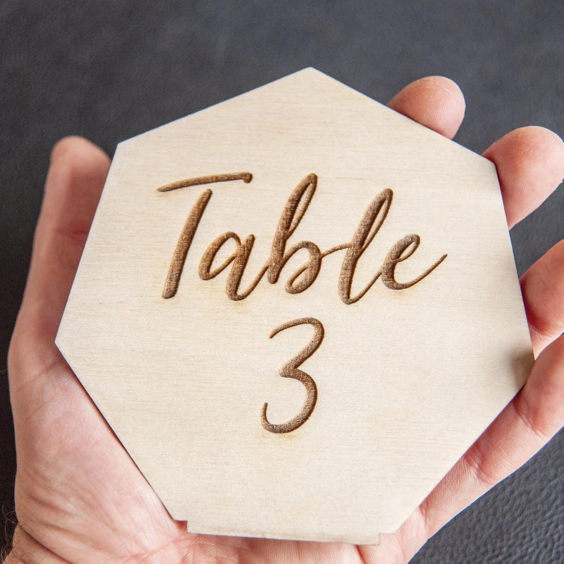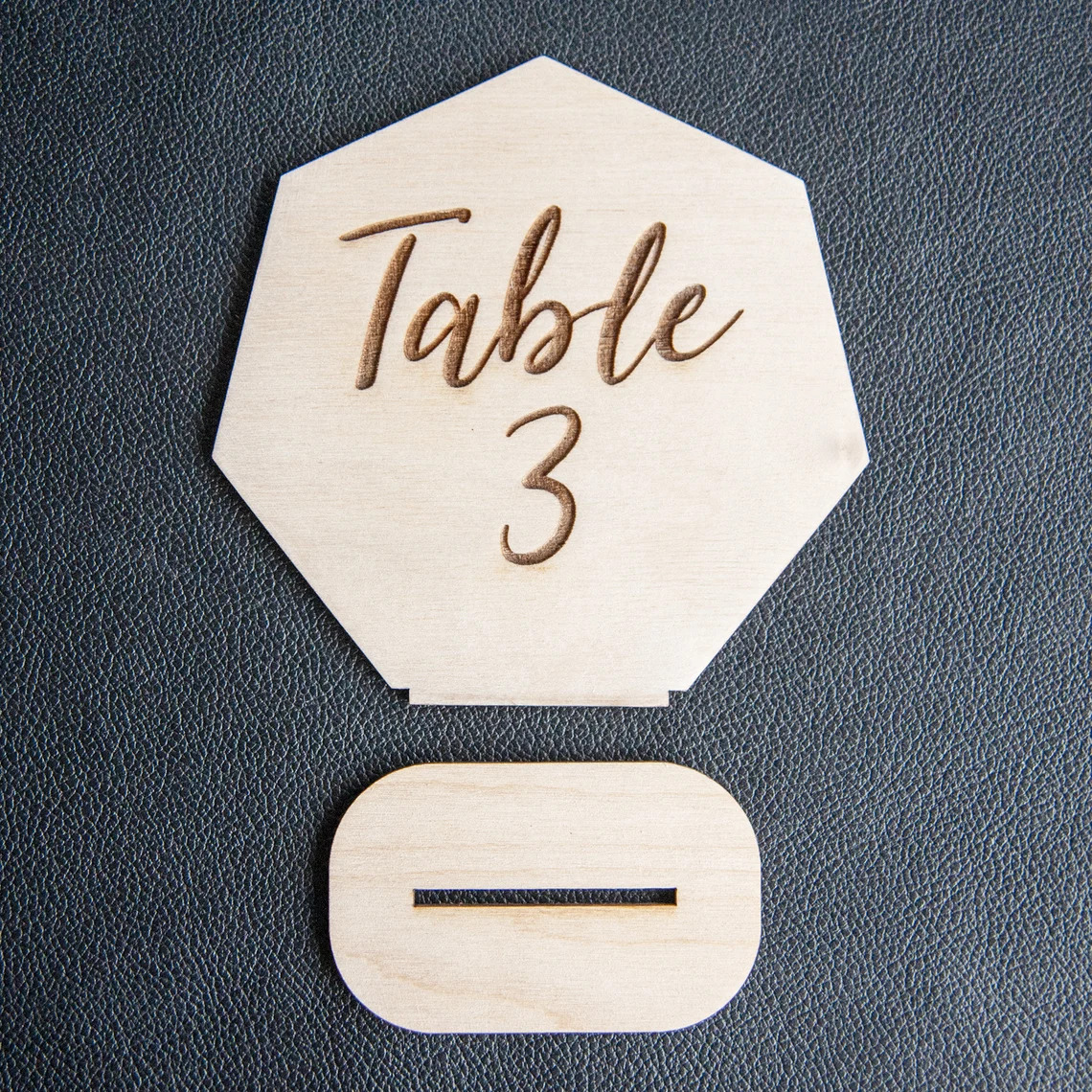 Čísla stolů z březové překližky ve tvaru sedmiúhelníku Vám krásně a přírodně pomohou k označení stolů na svatbě a přispějí tak Vašim hostům k lepší orientaci, kde je jejich čestné místo u stolu.