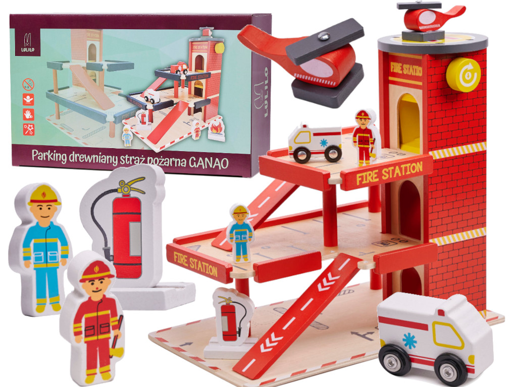 Dřevěná garáž se skládá ze čtyř pater, první tři jsou určeny pro parkování hasičských vozidel, je však zde místo také pro zaparkování dalších oblíbených aut vašeho dítěte.
