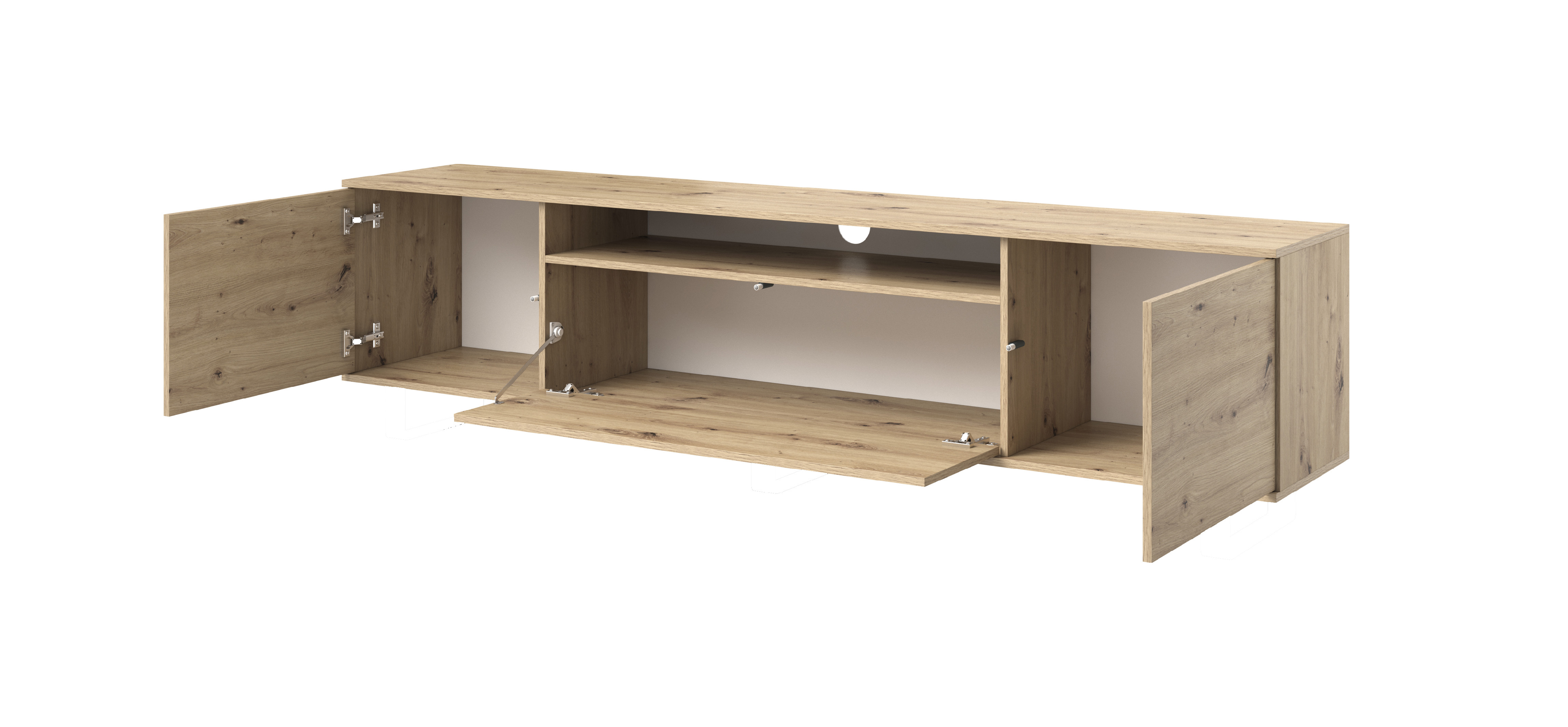 Naše komoda je skvělým řešením, pokud hledáte funkční TV stolek. Nábytek se bude skvěle vyjímat pod vaším vybavením. Skříňka má místo pro dekodér, který můžete nenápadně schovat pod televizi. Komoda je rozdělena na tři samostatné skříňky, jednu uprostřed a dvě po stranách, díky čemuž je mimořádně funkční a praktická. Komoda je celá v barvě dub řemeslný. Výhodou je systém PUSH TO OPEN, pohodlný mechanismus, který dvířka po stisknutí otevře. Komoda je bez osvětlení.