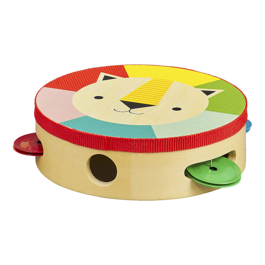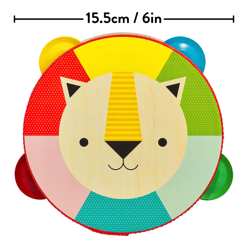 Zahrajte na tamburínu a zatančete si! Dřevěná tamburína s ilustrací duhového lva děti inspiruje k tvorbě hudby. Tamburína má 4 cimbálky, je vyrobena z topolové překližky a je nabarvena netoxickými rostlinnými barvami.