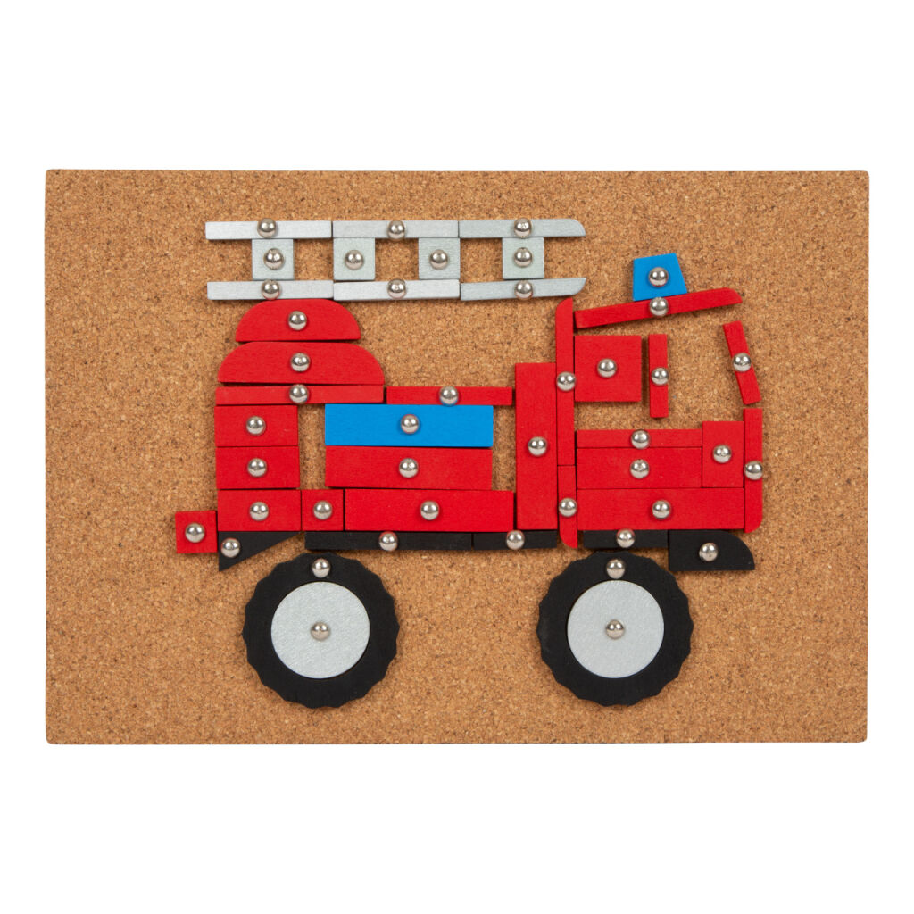 Obsáhlá kreativní hrací sada s tematikou rodiny! V balení najdete korkovou podložku, dřevěné kladivo, připínáčky a mnoho dílků z laminovaného dřeva v rozdílných tvarech a barvách. V krabici, která je vhodná i na uschování této hračky, najdete šest obrázkových předloh.