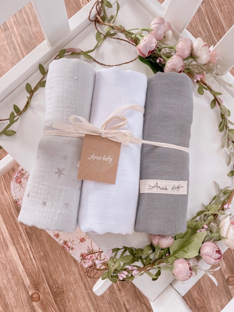 Mušelínové plenky lze používat od prvních dnů života - jako zavinovačku, lehkou deku, přebalovací podložku, prostěradlo nebo ručník.