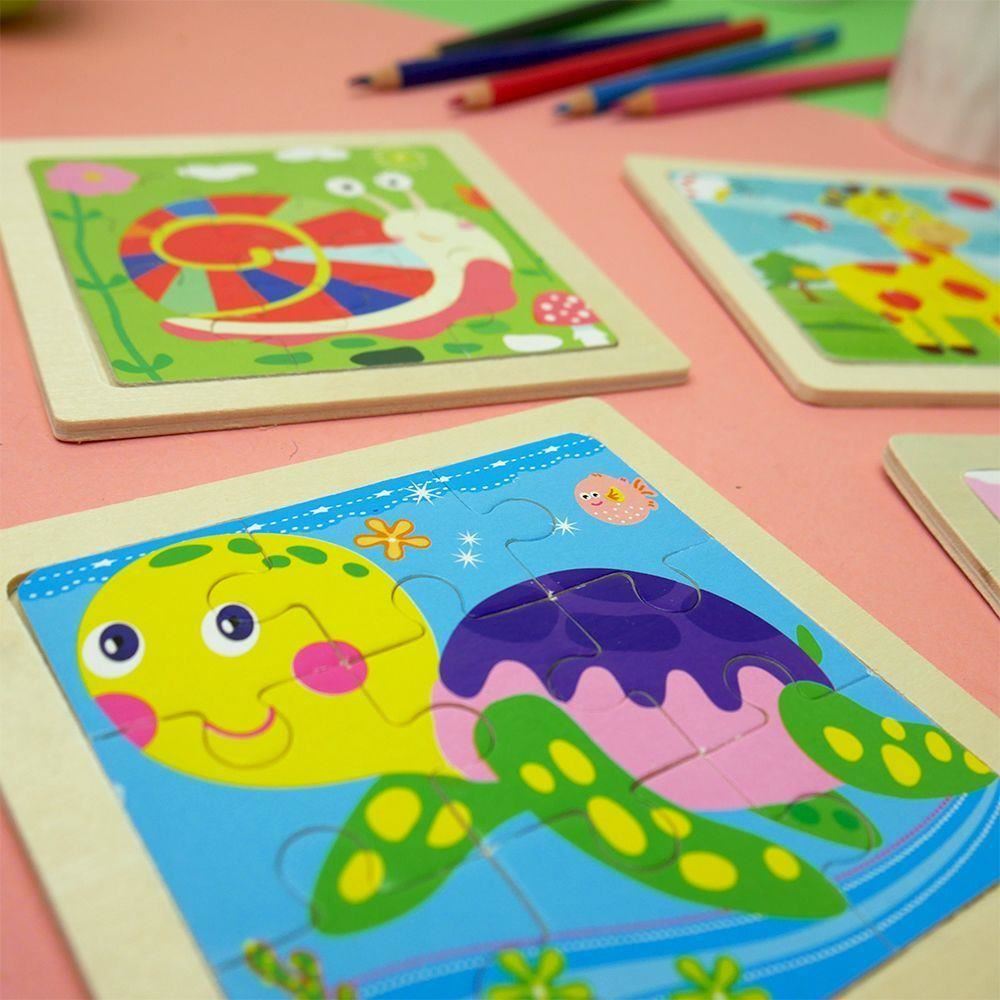 Dětské vkládací puzzle mohou děti skládat přímo do dřevěné podložky, která má zvýšené okraje pro snadnější skládání.