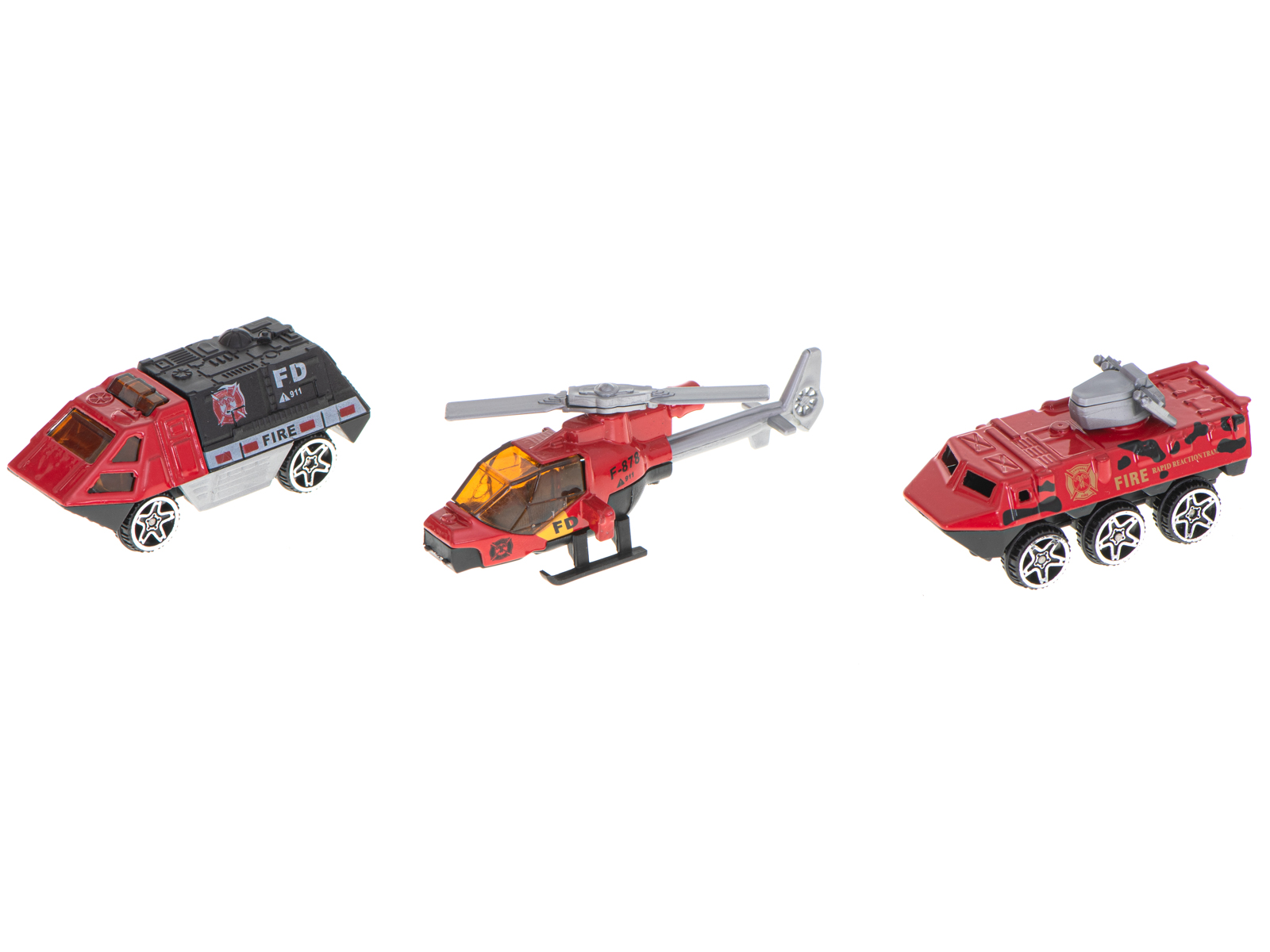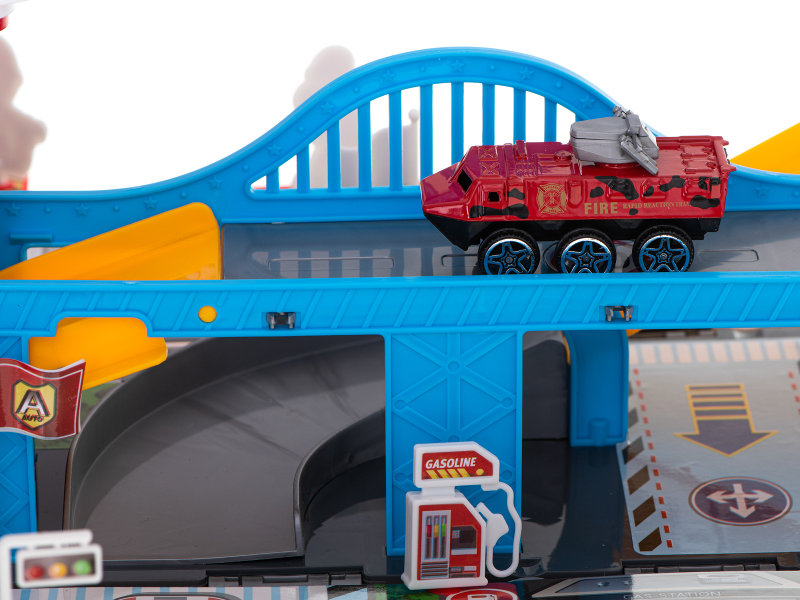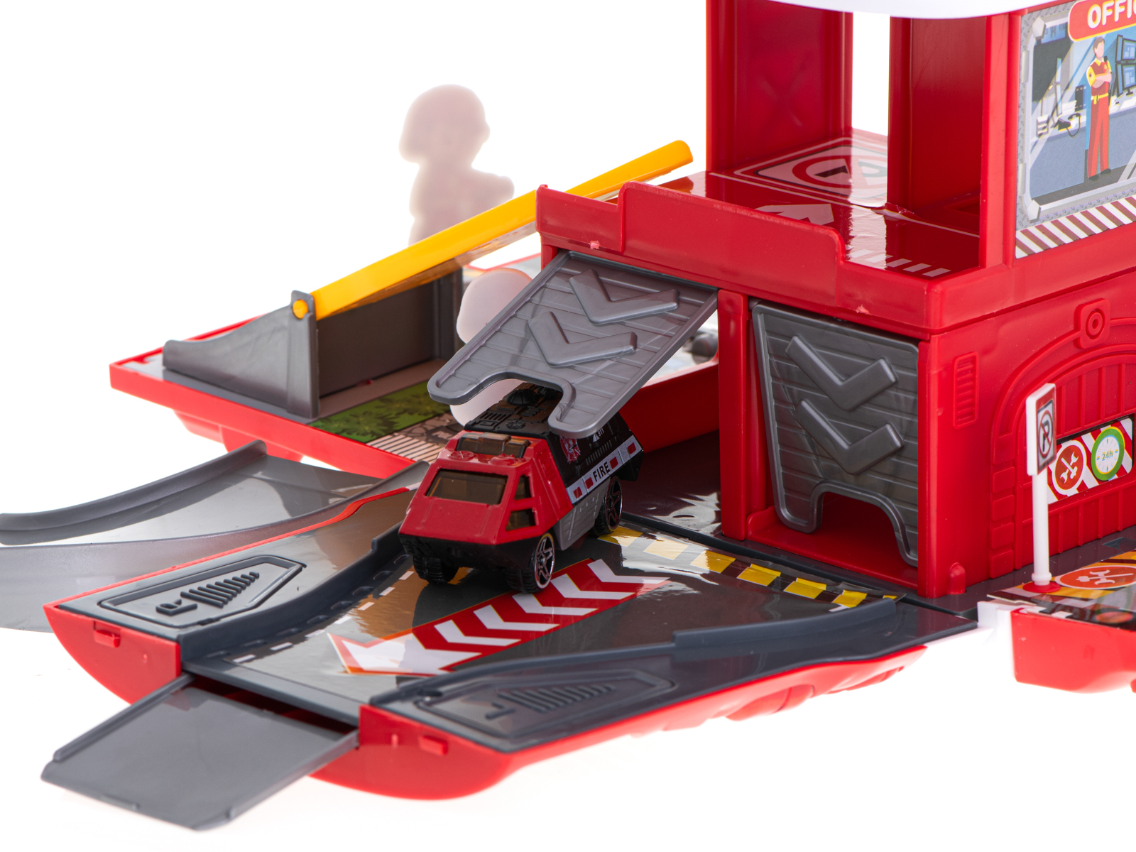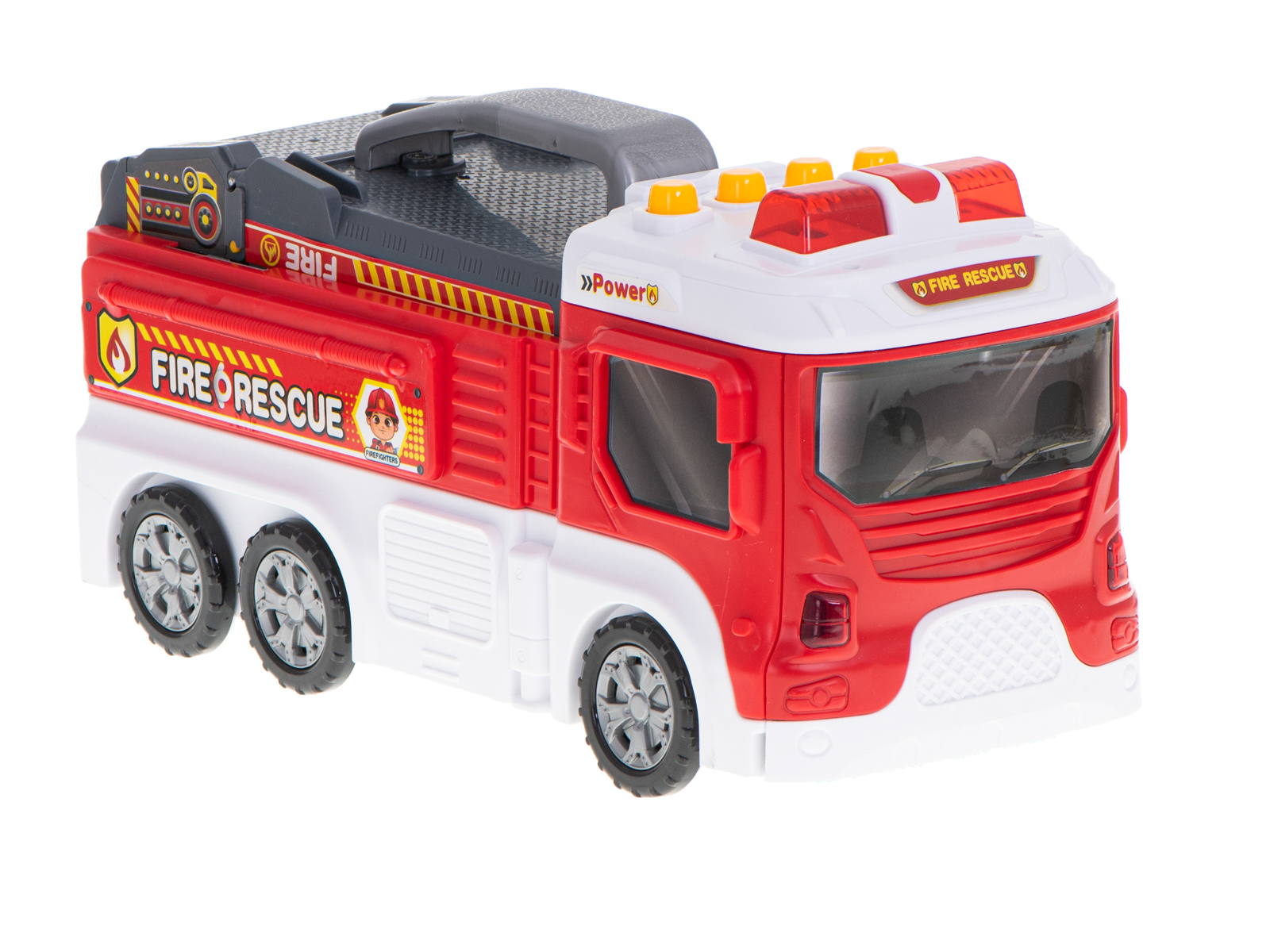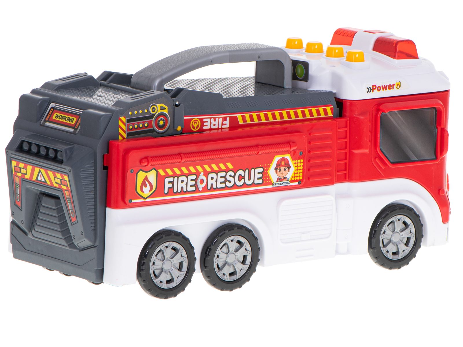 Velký přepravník v podobě hasičského auta, který na své palubě převeze auta obsažená v sadě.