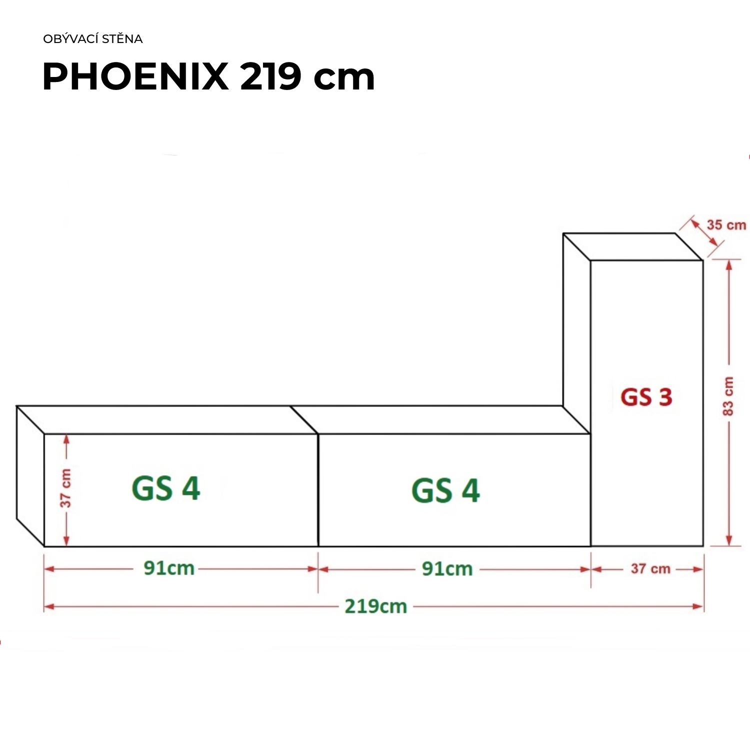 Ral Obývací stěna PHOENIX 4, 219 cm - Černý lesk
