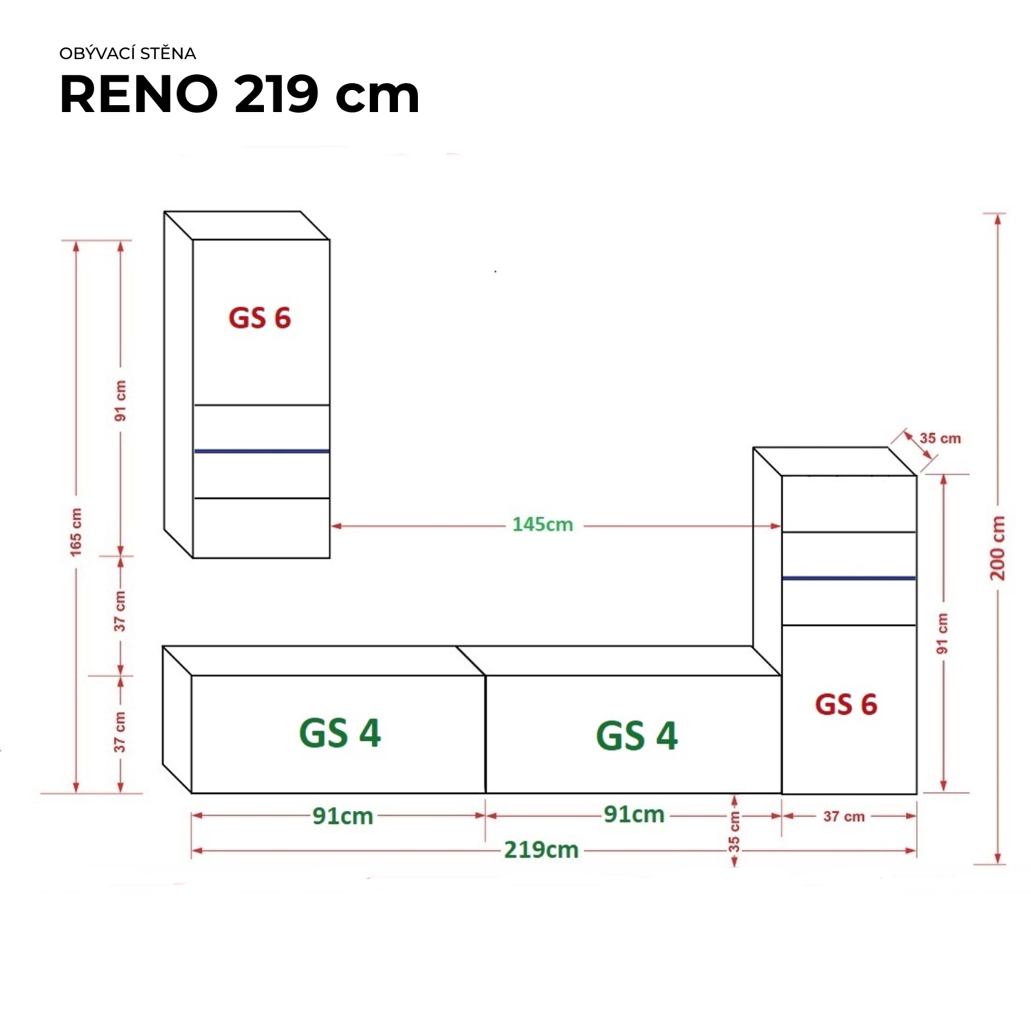 Ral Obývací stěna RENO 4, 219 cm - Černý lesk