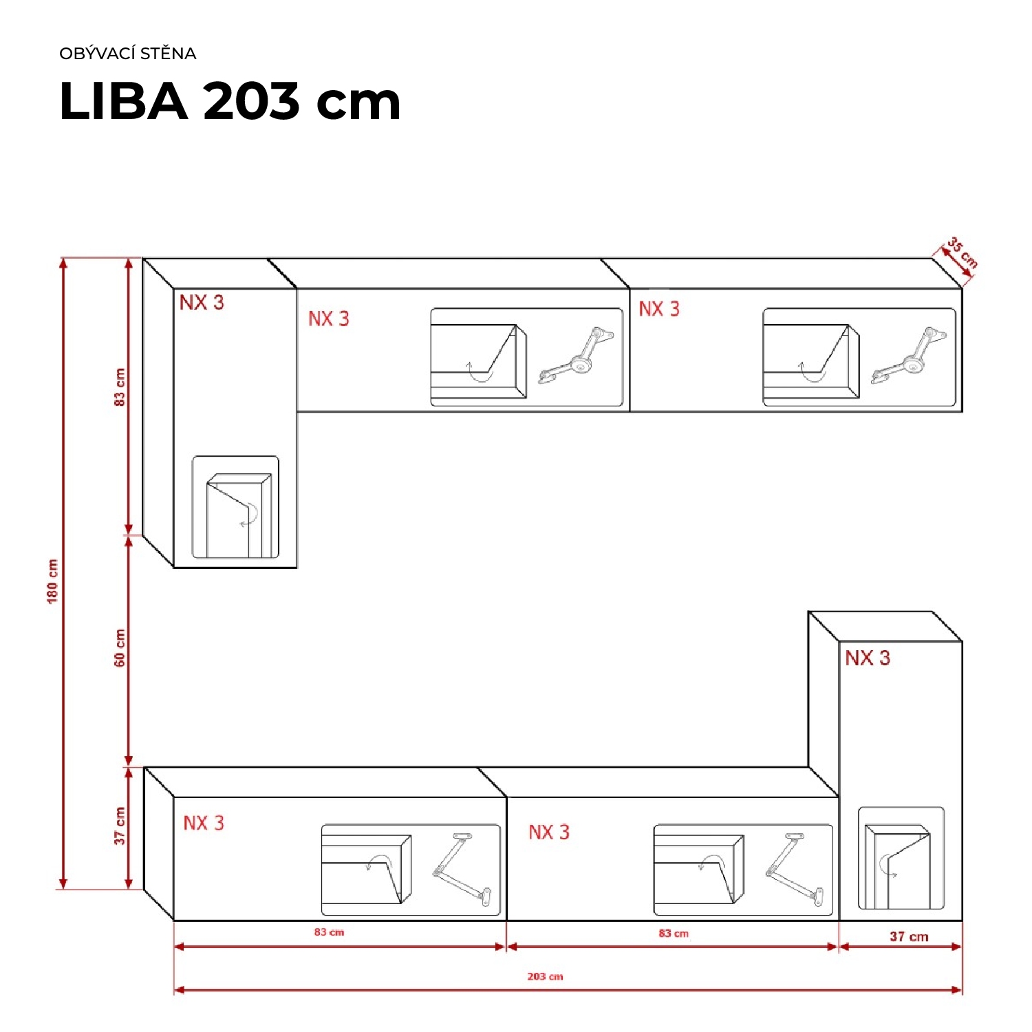 Ral Obývací stěna LIBA 2, 203 cm - Černý lesk