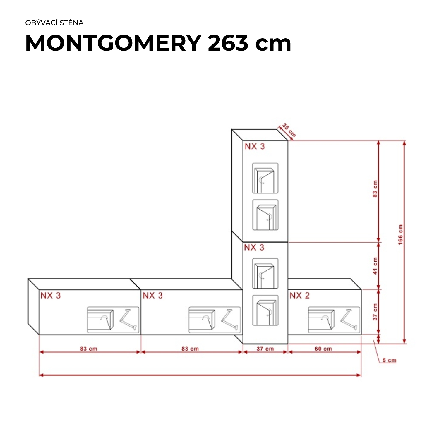 Ral Obývací stěna MONTGOMERY 1, 263 cm - Bílý lesk