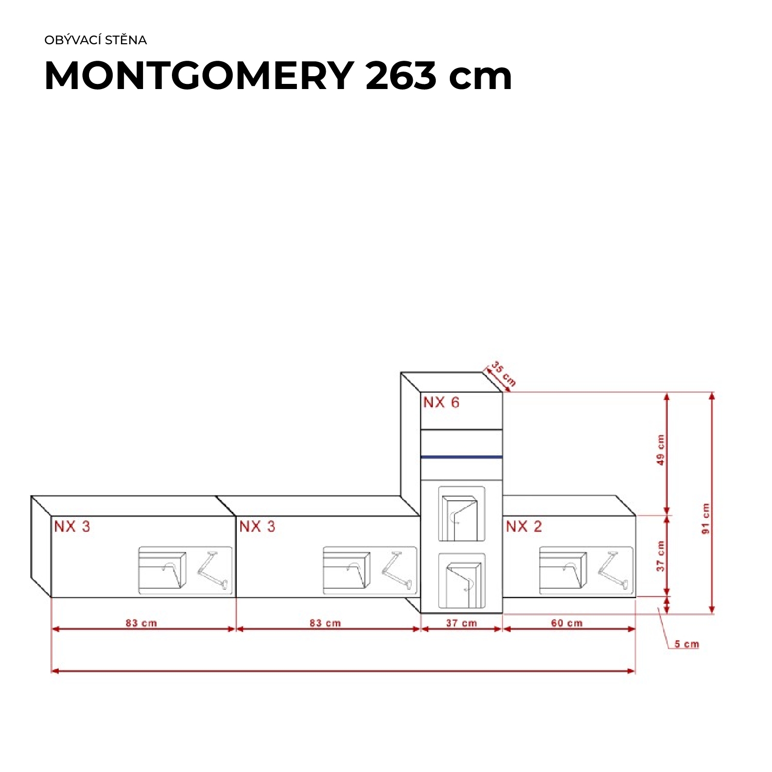 Ral Obývací stěna MONTGOMERY 3, 263 cm - Bílý lesk