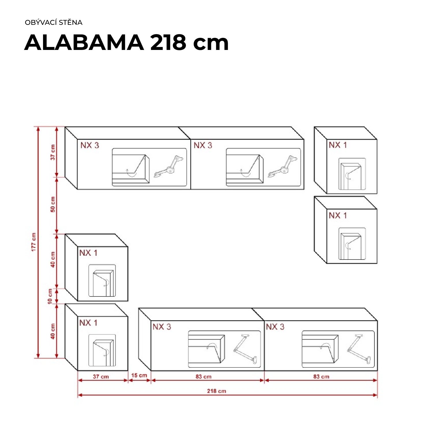 Ral Obývací stěna ALABAMA 218 cm - Černý lesk