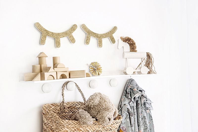Dřevěná nástěnná dekorace na zeď - Spící oči ve zlaté barvě. Sada obsahuje 2 ks spících očí a oboustrannou pásku.