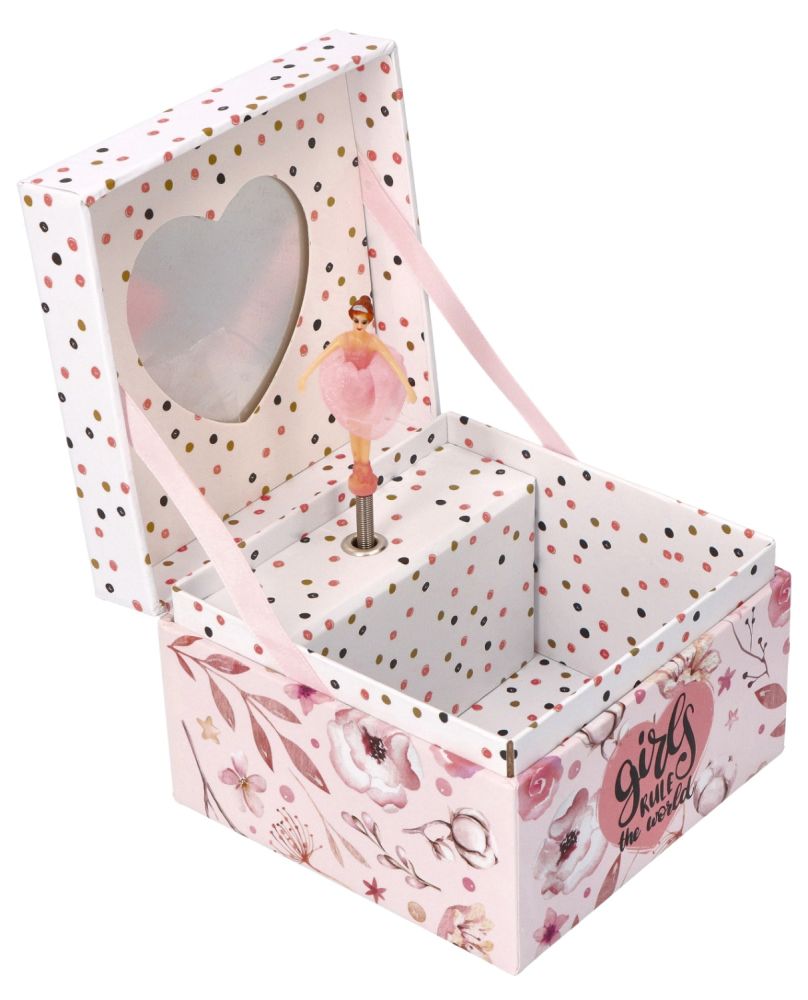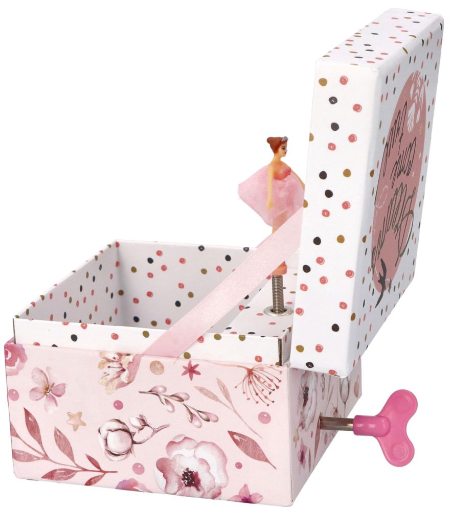 Hrací skříňka v růžové a bílé barvě s krásnými květy po stranách. V hlavní roli krásná, třpytivá baletka ve všech barvách duhy. Nádherné šaty, ve kterých je oblečená, dodávají charakter baletky a zrcadlo na zadní stěně působí dojmem, že se účastníme podívané ve velké aréně. Tentokrát hrací skříňka bez dalších přihrádek a šuplíků, ale místa je uvnitř dost.